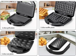 V balení najdete grilovací desku, desku na vafle a desku na sušenky ve tvaru oříšků. Nelepivý povrch usnadní čištění, kompaktní rozměry 22 × 22 × 8,5 cm šetří místo a délka kabelu 65 cm usnadní umístění na pracovní desce.