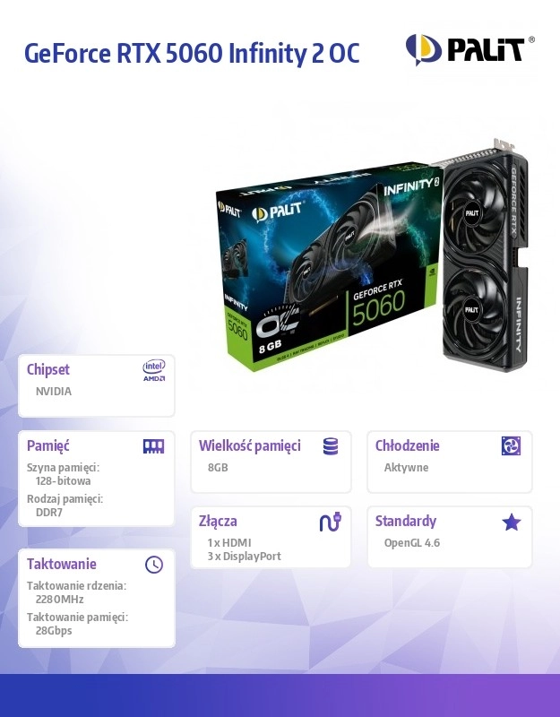 Palit GeForce RTX 5060 INFINITY 2 OC staví na moderní architektuře NVIDIA a cílí na hráče i tvůrce, kteří chtějí výkon bez ladění. Minimalistický vzhled s motivem nekonečna podporuje plynulý průtok vzduchu a čistou estetiku, která zapadne do většiny skříní.