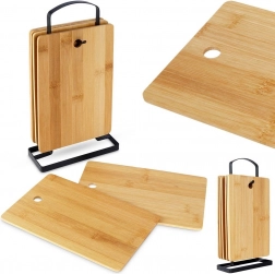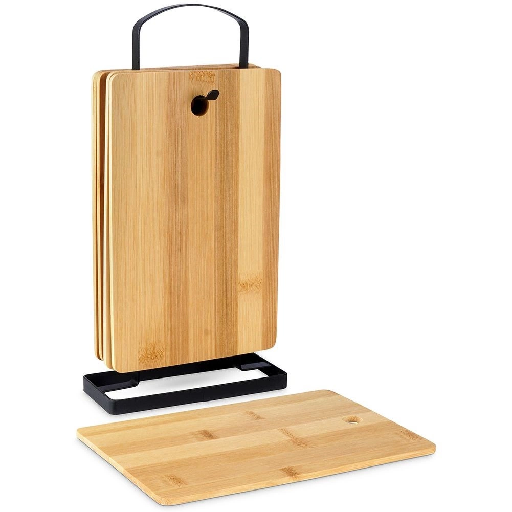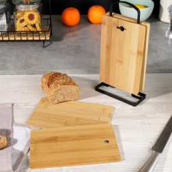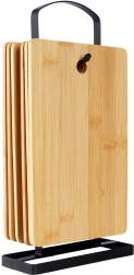 Sada šesti bambusových kuchyňských prkének v elegantním černém stojanu přináší pořádek i styl do každé kuchyně. Každé prkénko má rozměry 22 × 14 × 0,4 cm, stojan 15 × 6 × 29 cm, takže se snadno vejde na pracovní desku a udrží prkénka vždy po ruce.