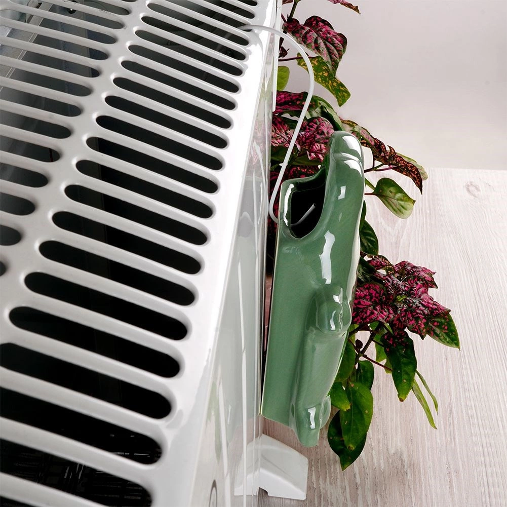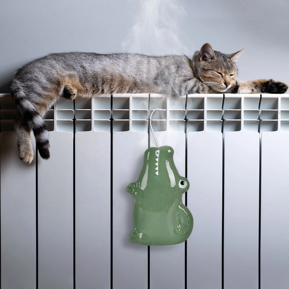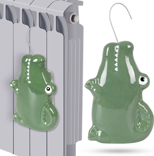 Roztomilý keramický zvlhčovač na radiátor ve tvaru krokodýla okamžitě doplní vlhkost v interiéru během topné sezóny. Stačí jej naplnit vodou, zavěsit na radiátor pomocí kovového háčku a nechat teplo přirozeně odpařovat vodu. Díky kompaktním rozměrům a dekorativnímu designu je ideální do dětského pokoje, obýváku i ložnice.