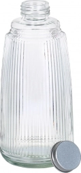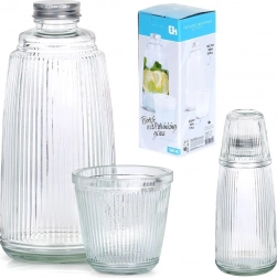 Tato univerzální skleněná sada kombinuje funkčnost a estetiku: karafa o objemu 1 l se šroubovacím uzávěrem a sklenice 220 ml s vertikálním rýhováním. Čiré, silné sklo krásně zvýrazní barvy nápojů a vynikne na každém stole doma i na zahradě.