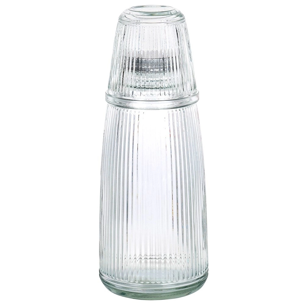 Elegantní sada karafy a sklenice z čirého skla s objemem 1 l a 220 ml je ideální pro každodenní servírování vody, limonád, džusů i drinků. Karafa má praktické šroubovací víčko proti hmyzu a prachu a sklenici lze nasadit na hrdlo karafy pro kompaktní skladování. Rýhované sklo dodává styl, jistý úchop a je vhodné do myčky.