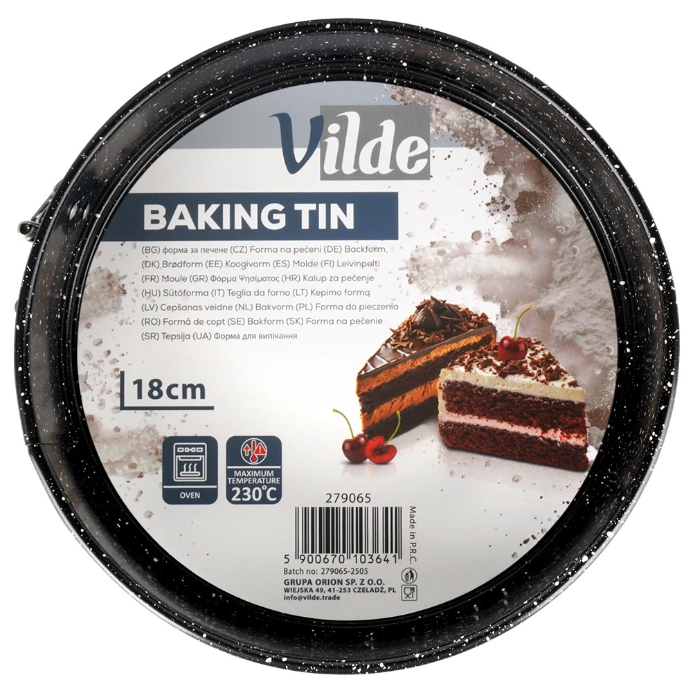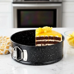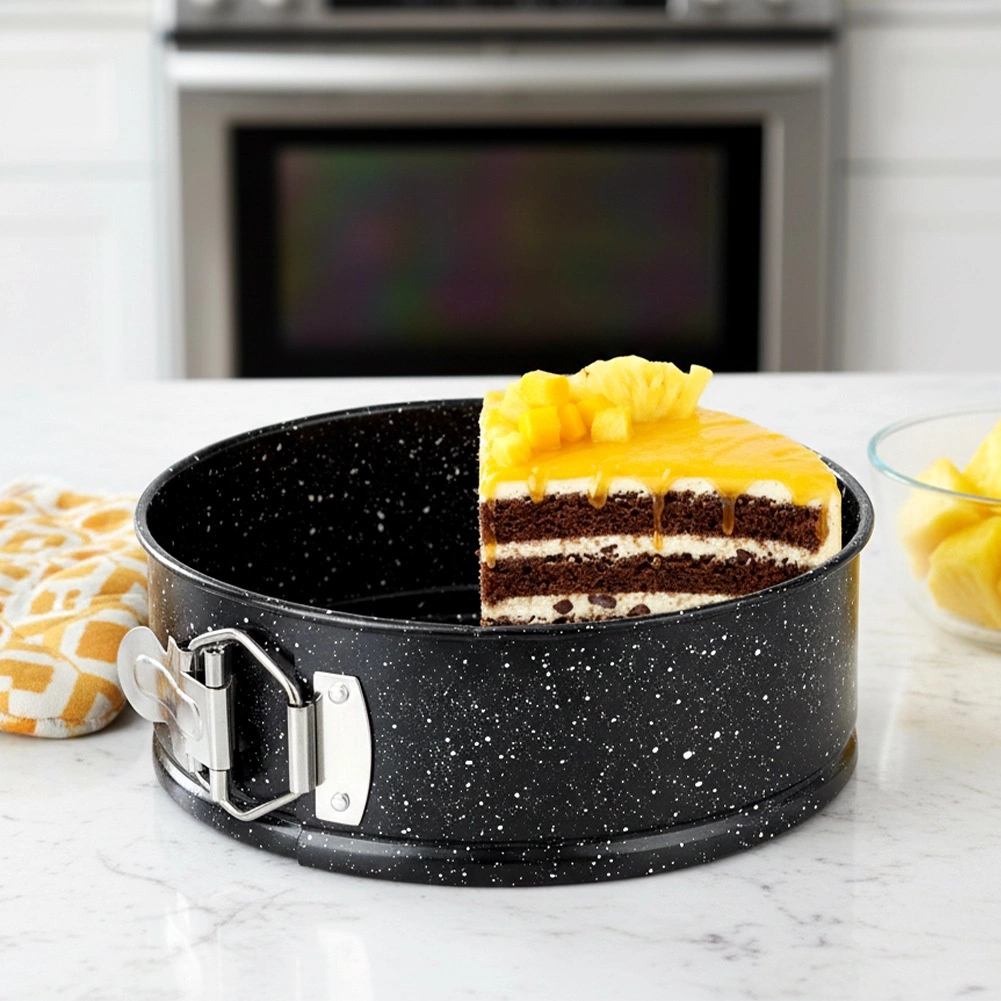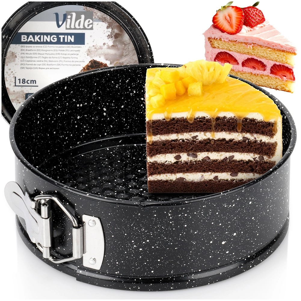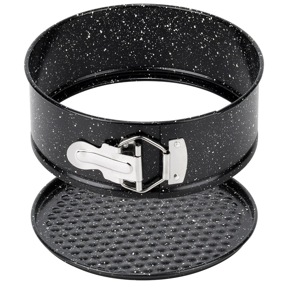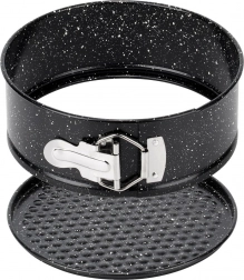 Praktická kulatá dortová forma s rozepínacím okrajem a vyjímatelným dnem pro snadné vyjmutí dezertů. Vyrobena z odolné uhlíkové oceli s granitovou nepřilnavou povrchovou úpravou pro rovnoměrné pečení, snadné čištění a spolehlivé výsledky při teplotách až 230 °C.