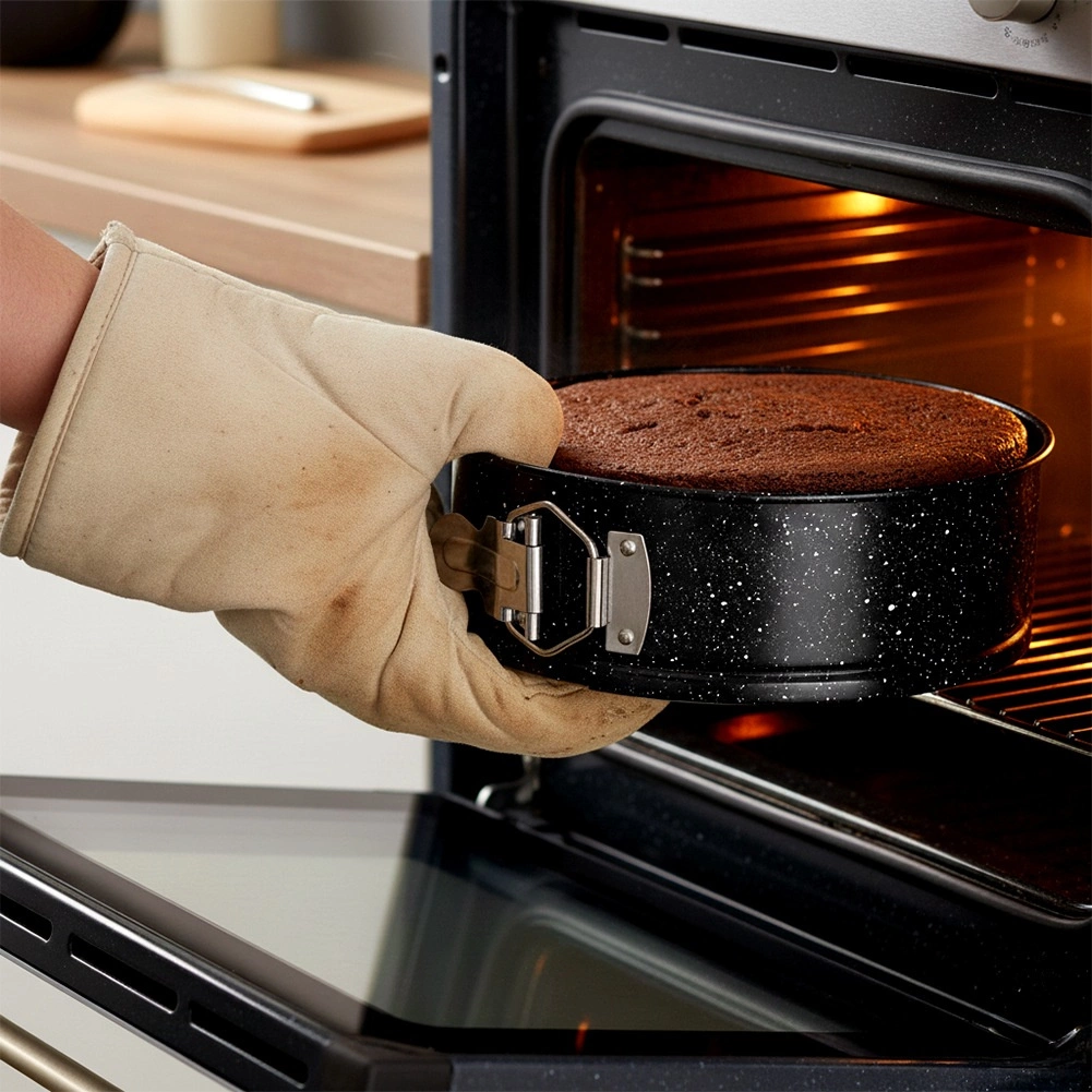 Praktická přezka umožní rychlé otevření formy a bezpečné vyjmutí upečeného korpusu bez narušení tvaru.