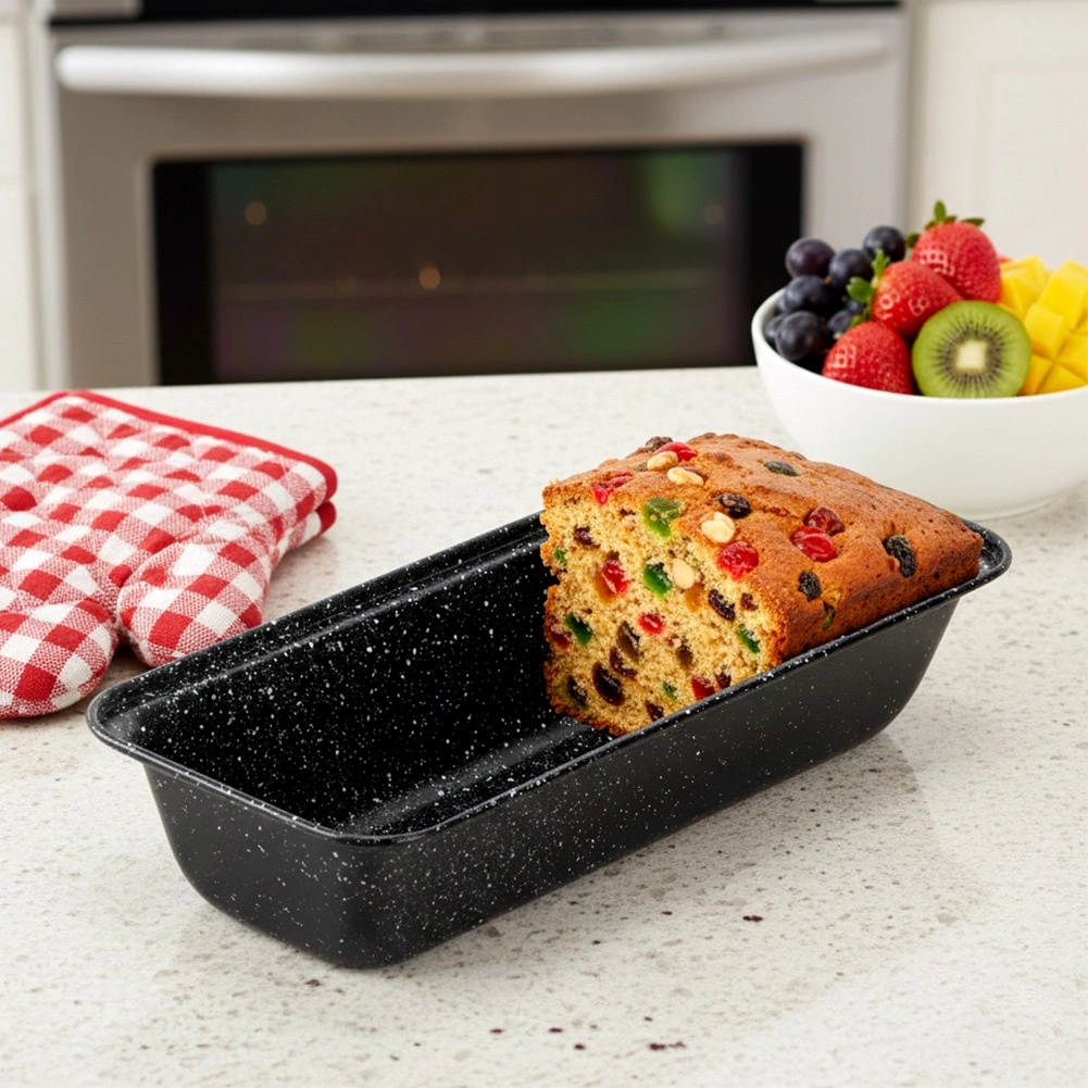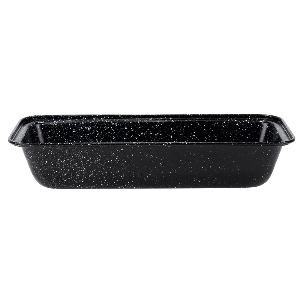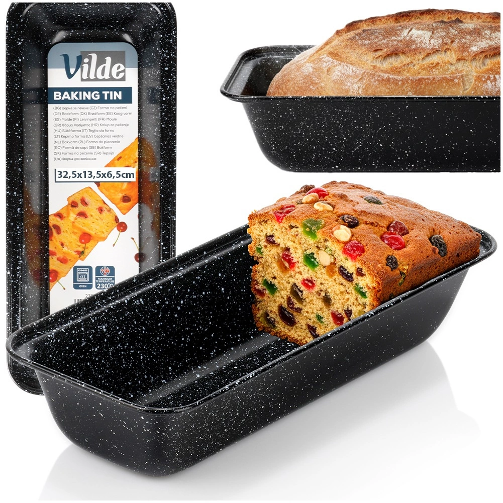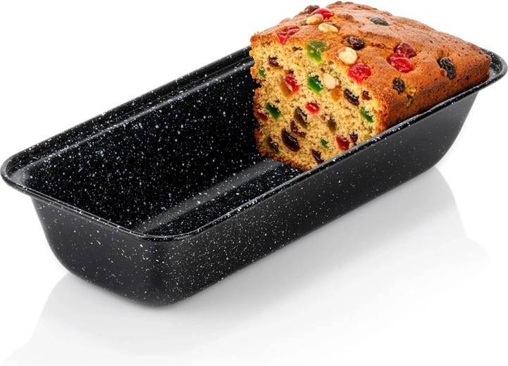 Praktická granitová forma na pečení s rozměry 32,5 × 13,5 × 6,5 cm pro domácí chléb, bábovky, biskupský chlebíček i paštiky. Vyrobena z odolné uhlíkové oceli s nepřilnavou granitovou povrchovou úpravou pro snadné vyklápění, rovnoměrné propečení a rychlé čištění. Vhodná do plynových i elektrických trub do 230 °C.