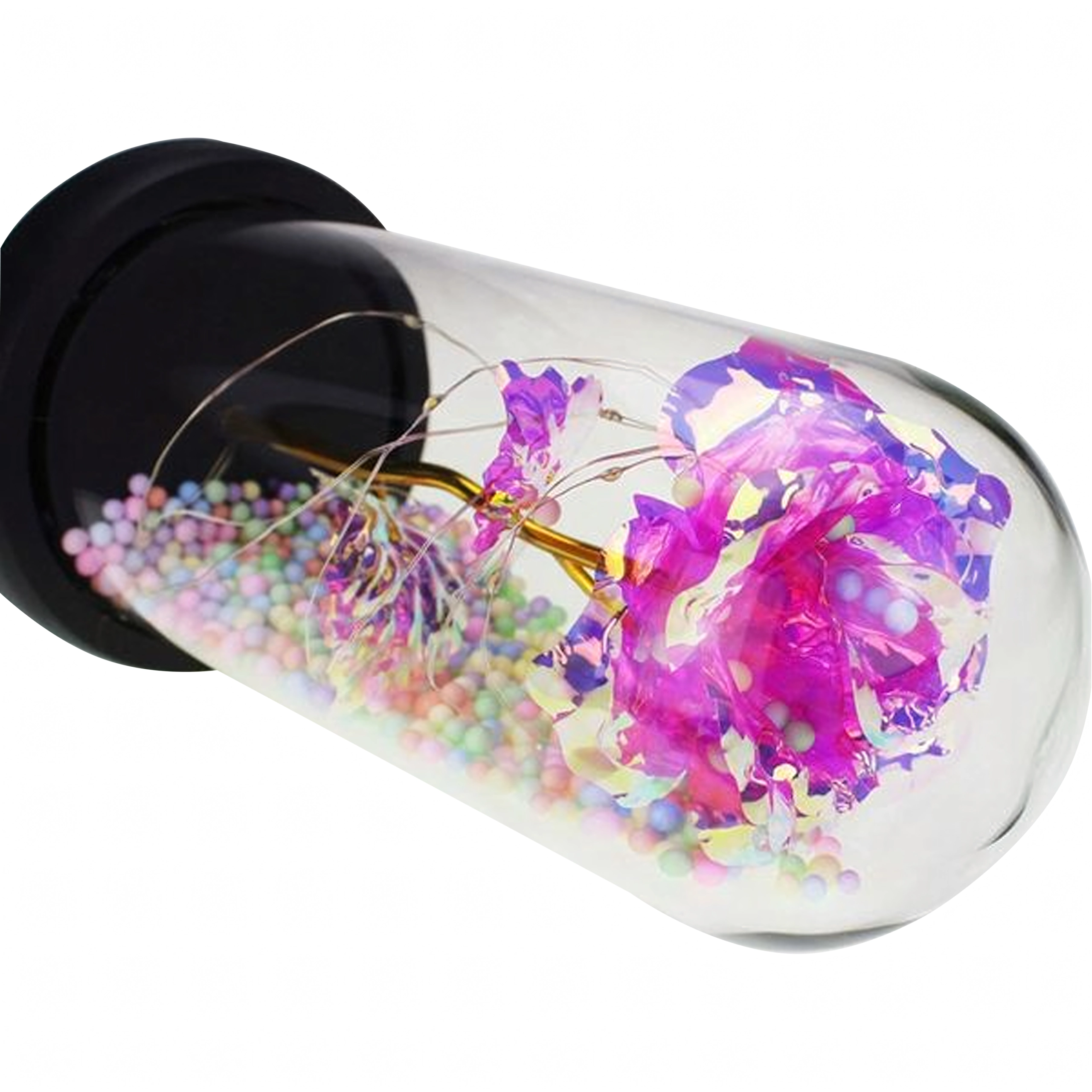 Iridescentní růžový květ se zlatým stonkem je omotaný jemnými LED světýlky, které vytvářejí kouzelný efekt i bez dalších dekorací.