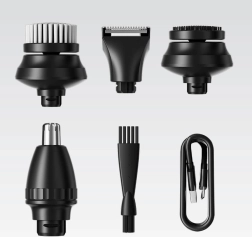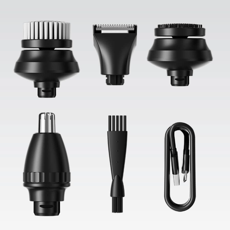 Sada obsahuje hlavu pro holení, zastřihovač chloupků v nose a uších, čisticí kartáček na obličej, masážní nástavec a zastřihovač vlasů s 3 nástavci (3/5/7 mm) pro přesné přizpůsobení délky. Dvě nastavení rychlosti zvyšují komfort a účinnost při různých typech vousů.