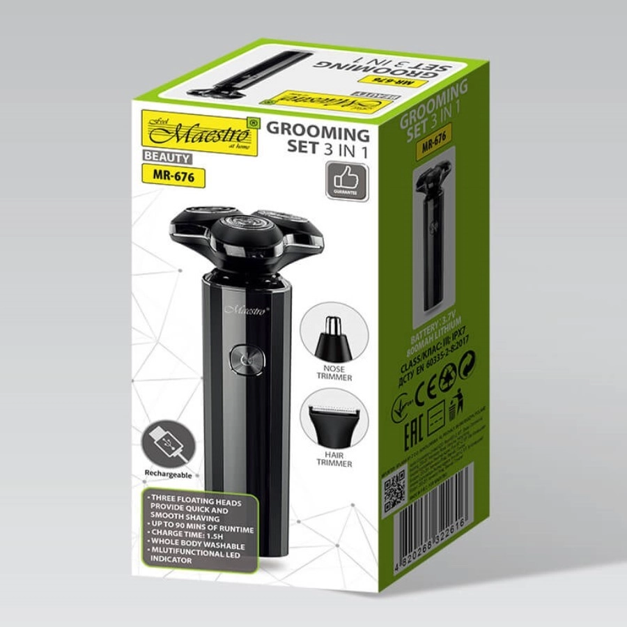 Sada na holení 3v1 USB‑C MR‑676 Maestro je praktické řešení pro kompletní péči o vousy a vlasy. Kombinuje výkonný holicí strojek, precizní zastřihovač nosu a uší a všestranný zastřihovač vlasů s nastavitelnými délkami. Díky kapacitní lithium baterii 800 mAh zvládne až 90 minut nepřetržitého provozu, přičemž se plně nabije za pouhých 90 minut přes USB‑C.