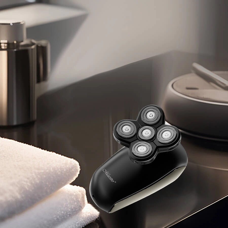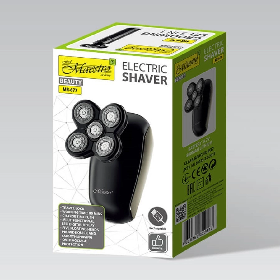 Kompaktní elektrický holicí strojek na hlavu Maestro MR-677 s nabíjením přes USB‑C nabízí dlouhou výdrž až 80 minut, rychlé nabíjení 90 minut, voděodolnost IPX7 a 5 precizních holicích hlav pro hladké a pohodlné oholení.