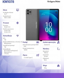 Moderní tablet KRÜGER&MATZ Eagle 1078S nabízí 11" IPS displej s rozlišením 1920 × 1200, 90Hz plynulost, výkonný 8jádrový procesor MediaTek a 8 GB RAM pro rychlou práci i zábavu. S 256 GB úložištěm (rozšiřitelným o microSD), LTE, Wi‑Fi ac, Bluetooth 5.2 a baterií 7000 mAh je připraven na celodenní používání, videohovory i multimédia.