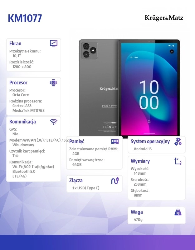 Lehký a výkonný tablet KRÜGER&MATZ EAGLE s displejem 10,1" IPS je skvělý pro práci i zábavu. Nabízí plynulý chod díky 8jádrovému procesoru, 4 GB RAM a 64 GB úložiště s možností rozšíření až o 512 GB. Díky LTE a dvoupásmové Wi‑Fi budete online kdekoli, zatímco baterie 6000 mAh zajistí celodenní výdrž. Foto výbavu tvoří zadní 5 Mpx s autofokusem a přední 2 Mpx, systém Android přináší intuitivní ovládání a přístup k tisícům aplikací.