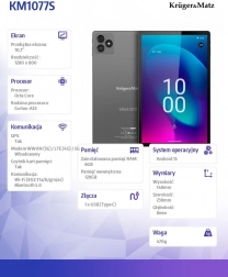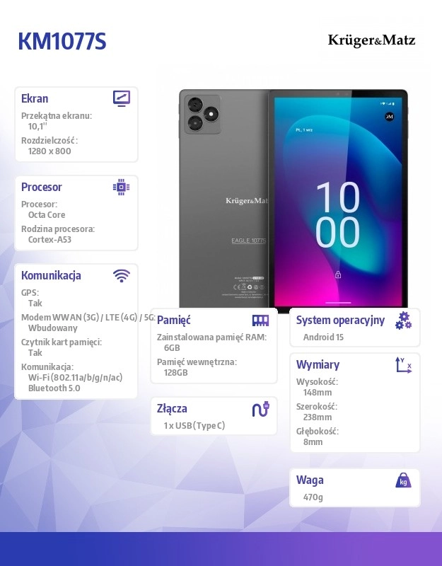Krüger&Matz Eagle 1077S kombinuje kompaktní design s praktickými funkcemi pro každodenní použití. Displej 10,1" IPS s rozlišením 1280 × 800 a poměrem 16:10 je skvělý pro videa, čtení i web. Osmijádrový procesor MediaTek MT8768A a 6 GB RAM zajišťují plynulý chod aplikací a rychlé přepínání mezi úlohami.