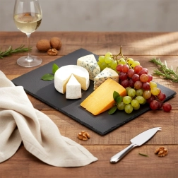 Deska z přírodního břidlicového kamene s broušenými hranami a autentickou texturou zvýrazní servírované pokrmy a dodá stolu moderní vzhled.