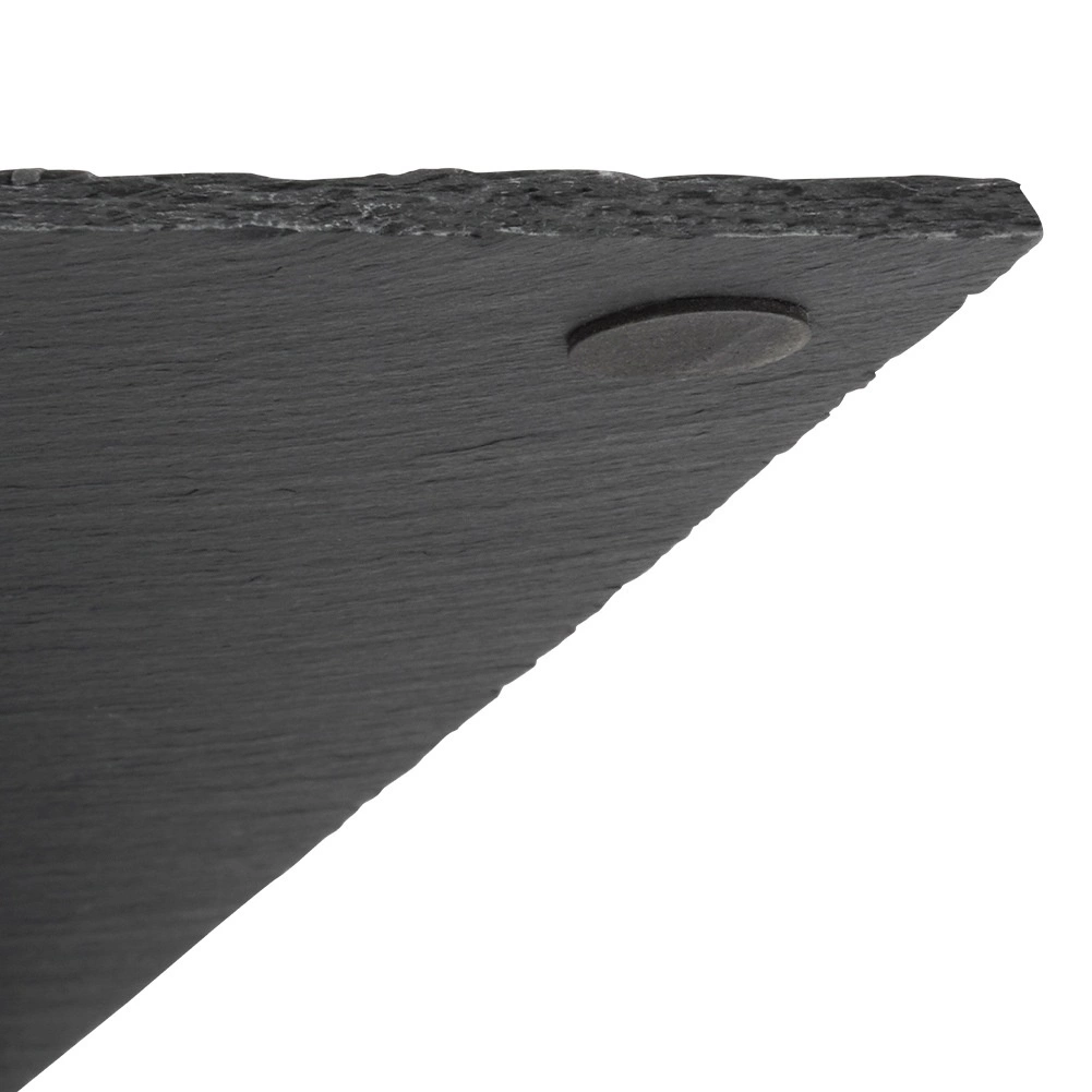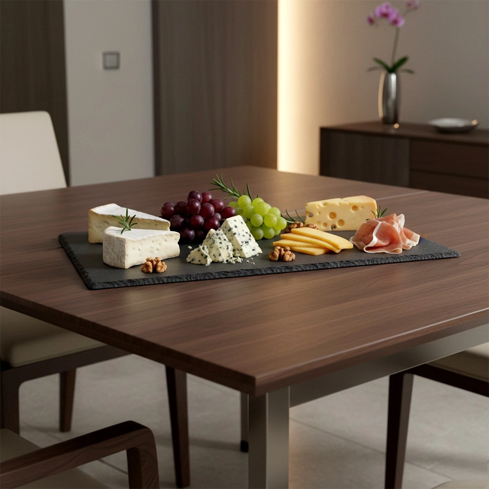 Deska je vyrobena z přírodního břidlicového kamene, který vyniká odolností a tepelnou setrvačností – lze ji před použitím ochladit pro studené pokrmy nebo jemně předehřát pro teplé delikatesy. Spodní strana je vybavena protiskluzovými podložkami, jež chrání stůl před poškrábáním a zajišťují stabilitu při krájení a servírování.