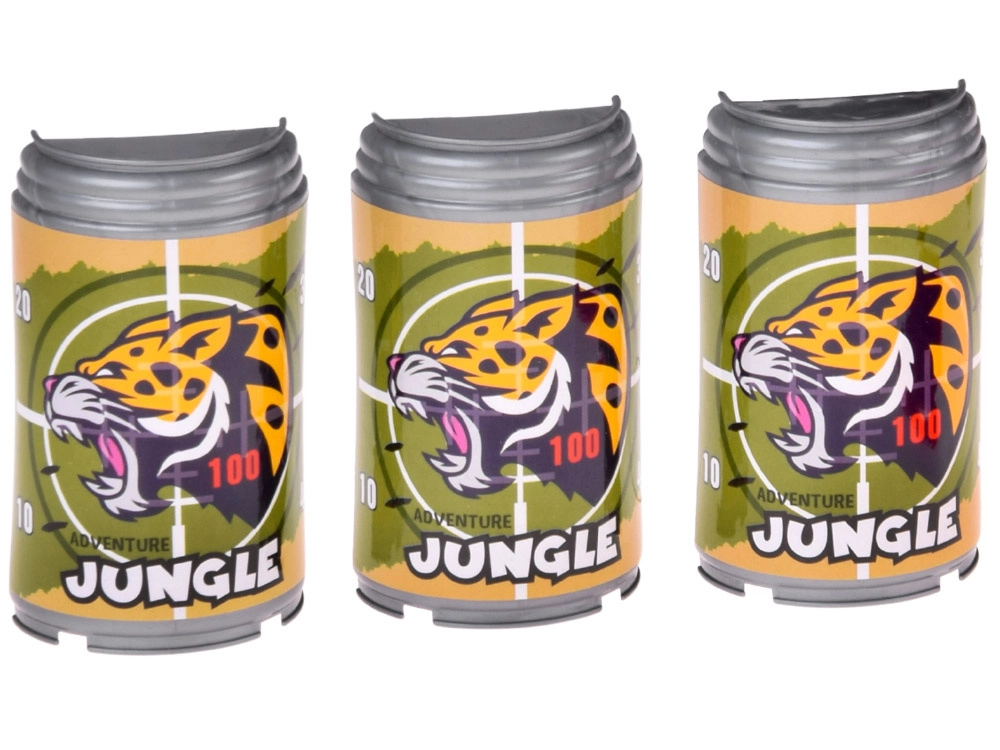 - 1× pistole JUNGLE, 6× pěnový náboj (gumová špička), 3× plastový terč – plechovka