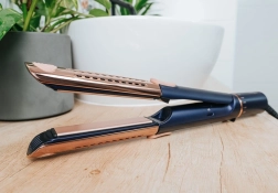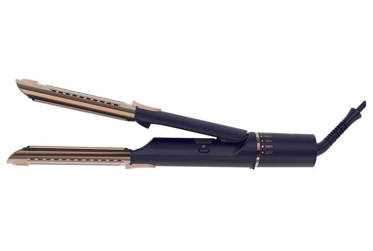 Styling je jemný a efektivní díky keramickým žehlícím plochám s rovnoměrným rozvodem tepla a pohyblivým destičkám, které se přizpůsobí tloušťce pramene bez tahání. Vnější část kleští má titanovou povrchovou úpravu pro vyšší odolnost a dlouhou životnost. Teplotu nastavíte v pěti krocích 140 / 160 / 180 / 200 / 220 °C dle typu vlasů; na nejnižší teplotu je připravena už za 30 sekund.