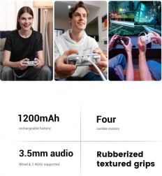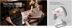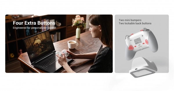 Pro náročné hráče nabízí optické mikrospínače ABXY, přesný mechanický D‑pad, dva mini bumpery R5/L5, dvě zadní programovatelná tlačítka R4/L4 a režim krátkého stisku spouští pro rychlé FPS akce. Vylepšená haptika se čtyřmi motorky přináší intenzivní odezvu v úchopech i spouštích. Součástí je i praktická nabíjecí stanice pro pohodlné nabíjení a uložení.