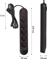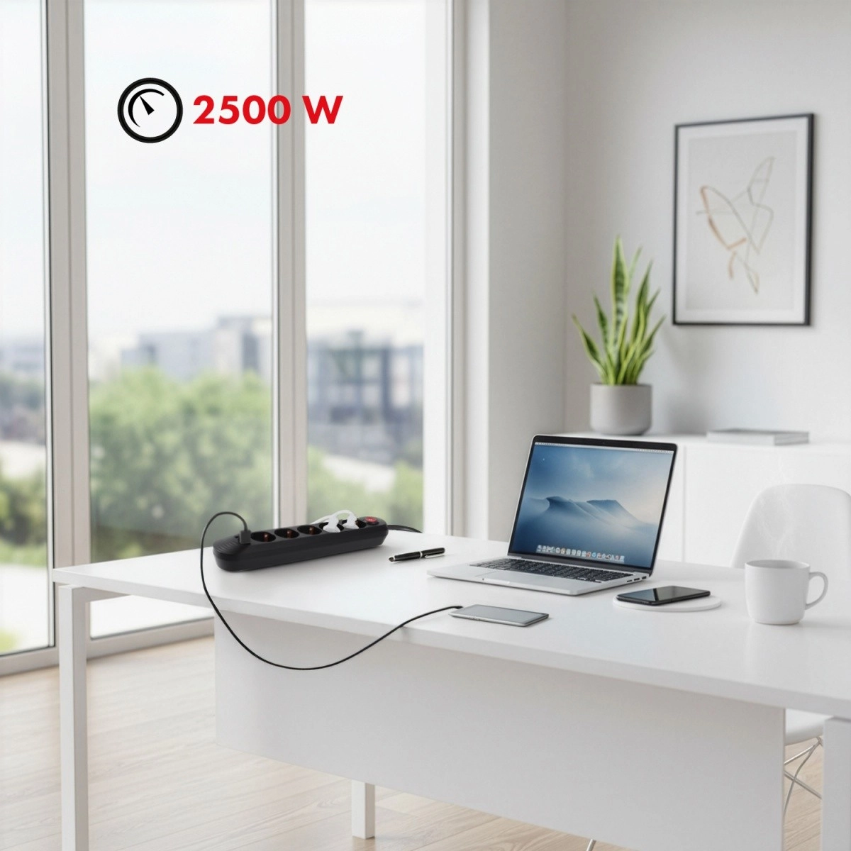 Tato kompaktní a odolná napájecí lišta kombinuje klasické zásuvky se zabudovaným USB nabíjením, takže ušetříte místo i adaptér. Široký rozsah vstupního napětí 110–240 V AC (50/60 Hz) zaručuje spolehlivý provoz v různých podmínkách a maximální zátěž 2500 W pokryje většinu běžných spotřebičů.