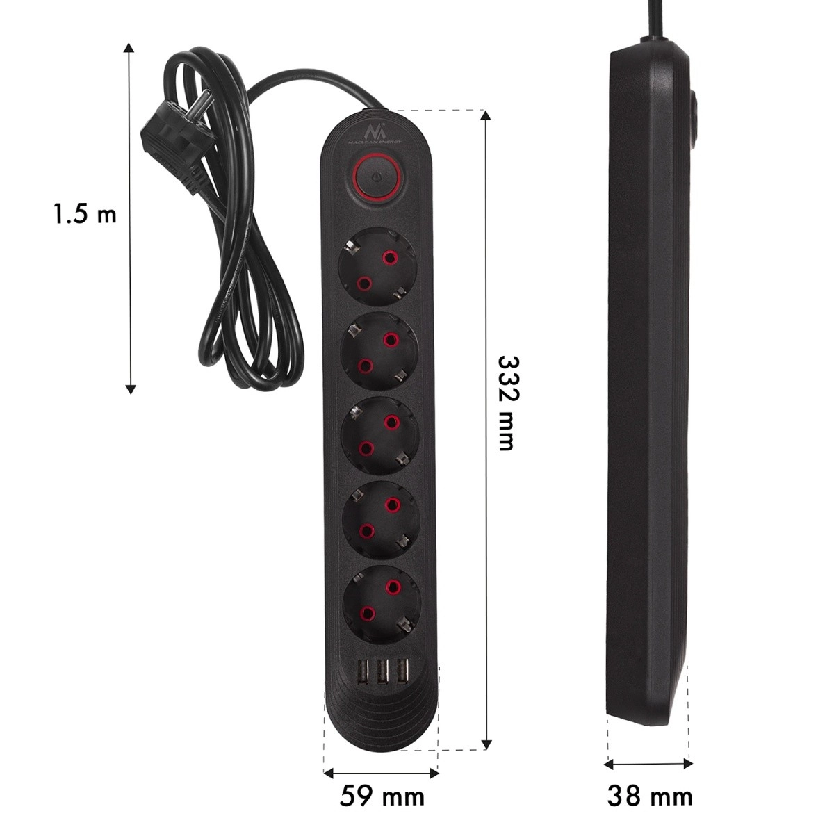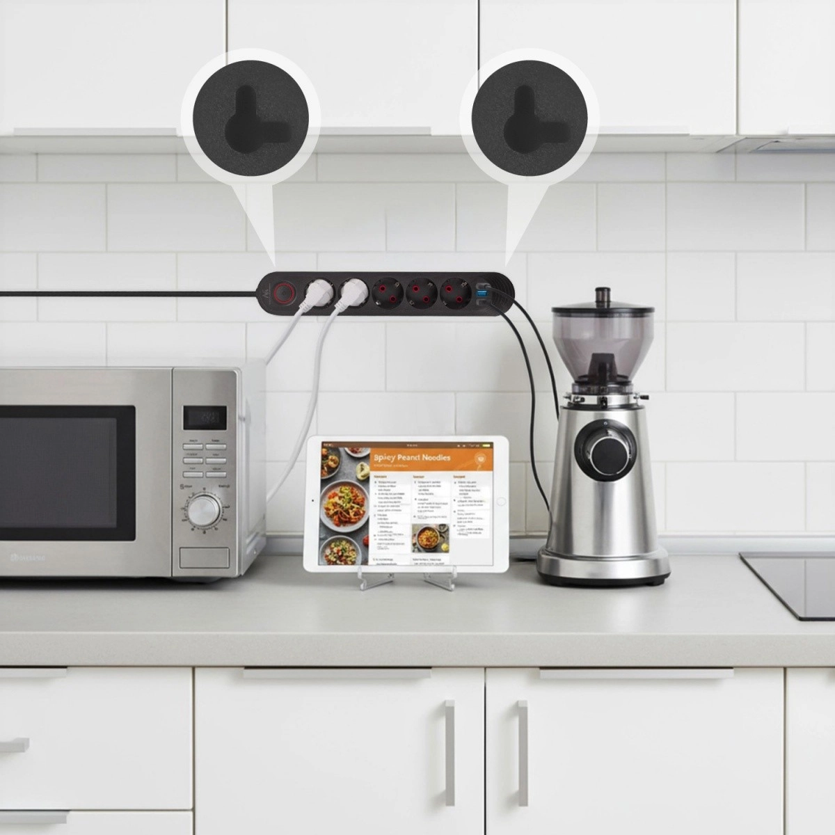 Pět zásuvek Schuko a tři USB porty umožňují napájet spotřebiče a zároveň nabíjet telefony, tablety či sluchátka – bez nutnosti samostatných adaptérů.