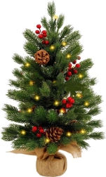 Kompaktní umělý vánoční stromek o výšce cca 60 cm krásně rozzáří každý interiér. Má teplé LED osvětlení s 3 režimy, realistické jehličí, dekor červených bobulek a přírodních šišek a stabilní základnu v jutě. Součástí jsou baterie 3× AG13 pro okamžité použití.