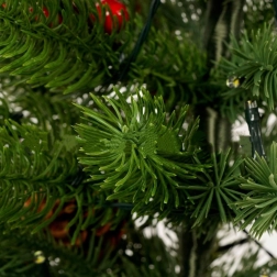Integrované LED světelné řetězy se 3 režimy svícení zajišťují jemné teplé světlo. Ohebná větvičková konstrukce umožňuje snadné tvarování, zatímco dekor červených bobulek a šišek dodává přírodní a klasický vzhled. Zatížená základna obalená jutou drží stromek pevně na místě a podtrhuje rustikální styl.