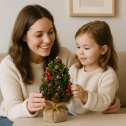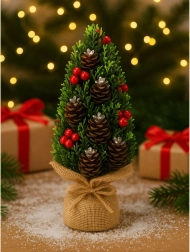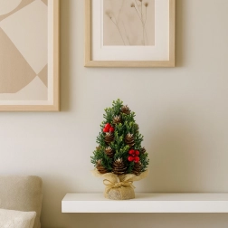 Elegantní mini vánoční stromek je ideální volbou pro ty, kteří chtějí rychle a efektně dozdobit interiér. Husté zelené větvičky doplňují přírodní šišky a výrazné červené bobule, které dodávají dekoraci přírodní a slavnostní vzhled. Jutová základna podtrhuje rustikální styl a zajišťuje snadné sladění s ostatním vánočním dekorováním.