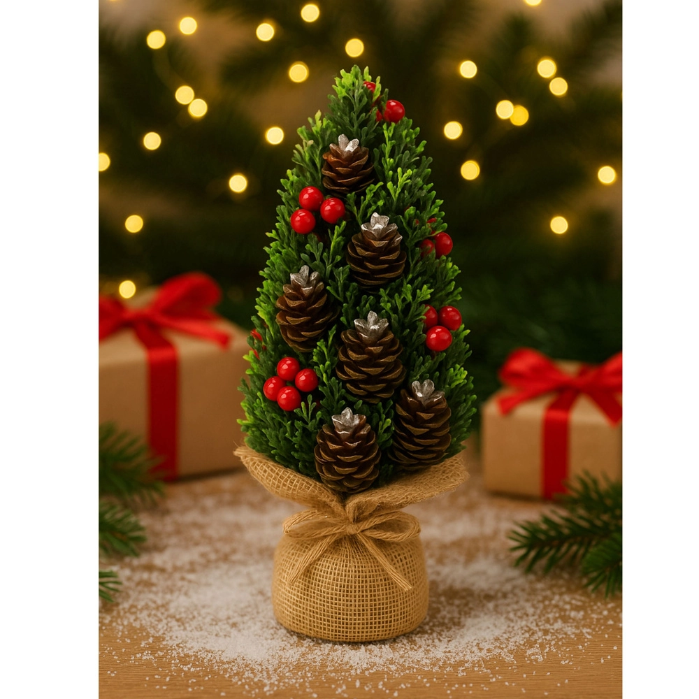 Zpříjemněte si adventní čas stylovou dekorací: mini vánoční stromek s realistickou zelení, přírodními šiškami a červenými bobulkami. Díky kompaktním rozměrům, stabilní zatížené základně a rustikálnímu jutovému obalu se hodí na stůl, polici i recepci a okamžitě navodí sváteční atmosféru.
