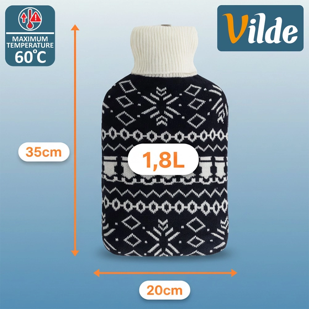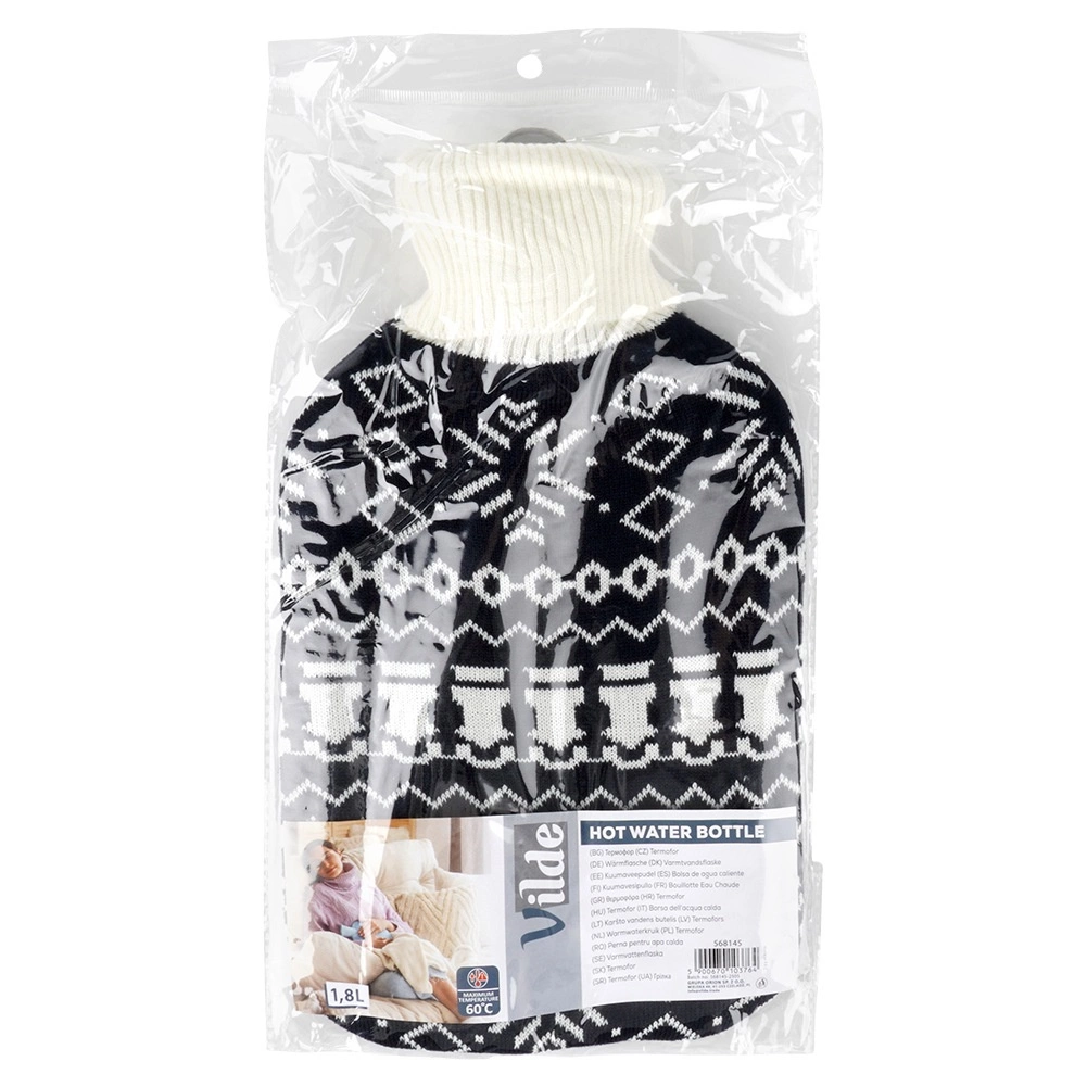 Termofor Vilde s objemem 1,8 l je spolehlivý pomocník pro každodenní domácí péči. Pletený potah v kontrastním černo‑bílém nordickém vzoru je příjemný na dotek, zvyšuje komfort a chrání pokožku před přímým žárem. Díky kvalitní gumové lahvi a pevnému šroubovacímu uzávěru si užijete bezpečné a dlouhotrvající teplo.