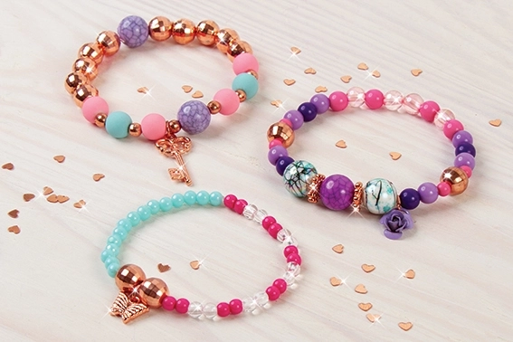 Díky 90 korálkům, 3 přívěskům a pružné gumičce snadno navrhneš jedinečné náramky pro každou příležitost.