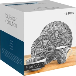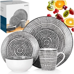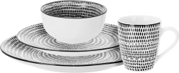 Stylová porcelánová jídelní sada pro 4 osoby v moderním černo‑bílém designu. Obsahuje talíře, misky a hrnky pro kompletní stolování. Je vhodná do myčky i mikrovlnky, má odolné provedení a efektní geometrický vzor, který pozvedne každodenní i sváteční tabuli.