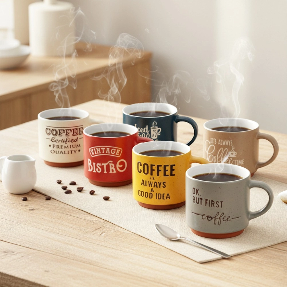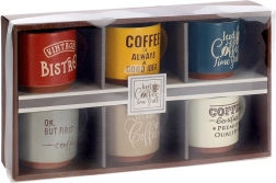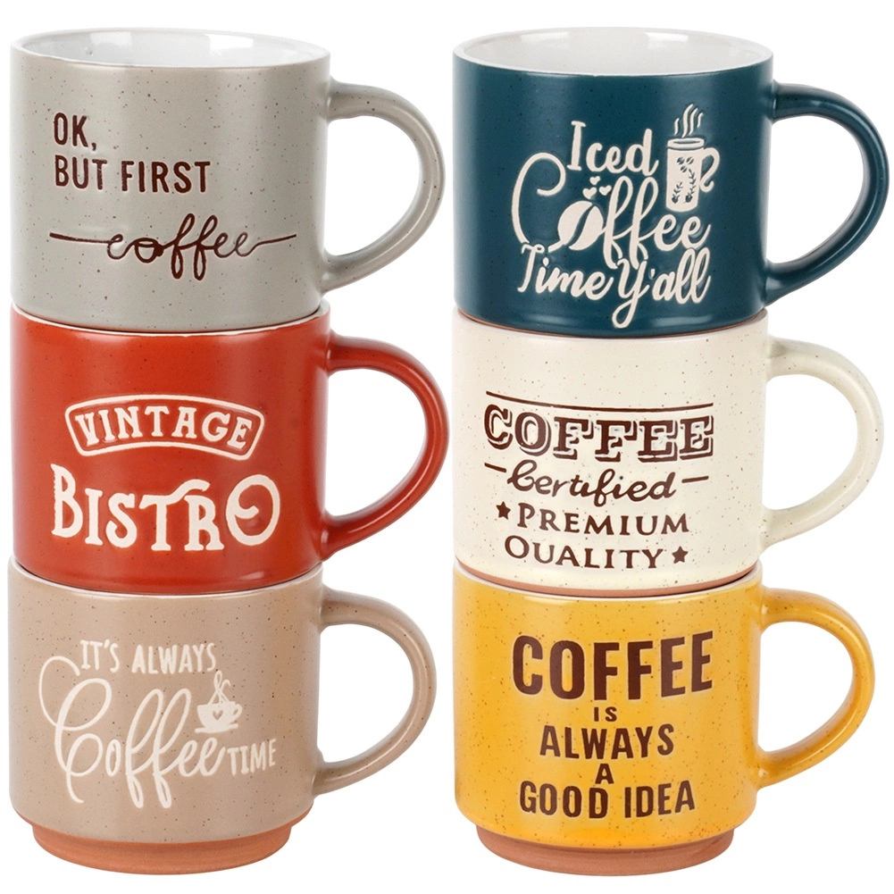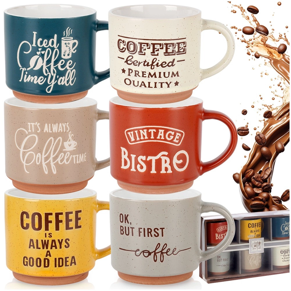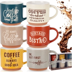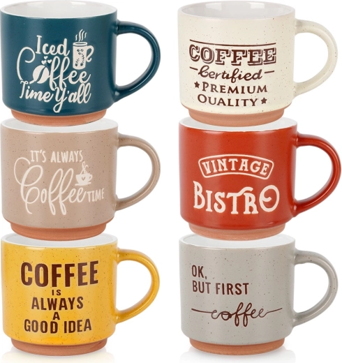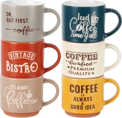 Dekor v podobě kávových sloganů a různorodých barev dodá vaší kuchyni osobitý styl. Hrnky se snadno udržují, jsou vhodné do myčky nádobí a bez obav v nich ohřejete nápoj v mikrovlnné troubě. Díky stohovatelnému tvaru je také snadno uložíte a ušetříte místo ve skříňce.