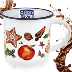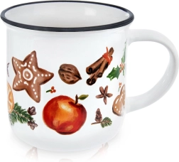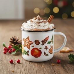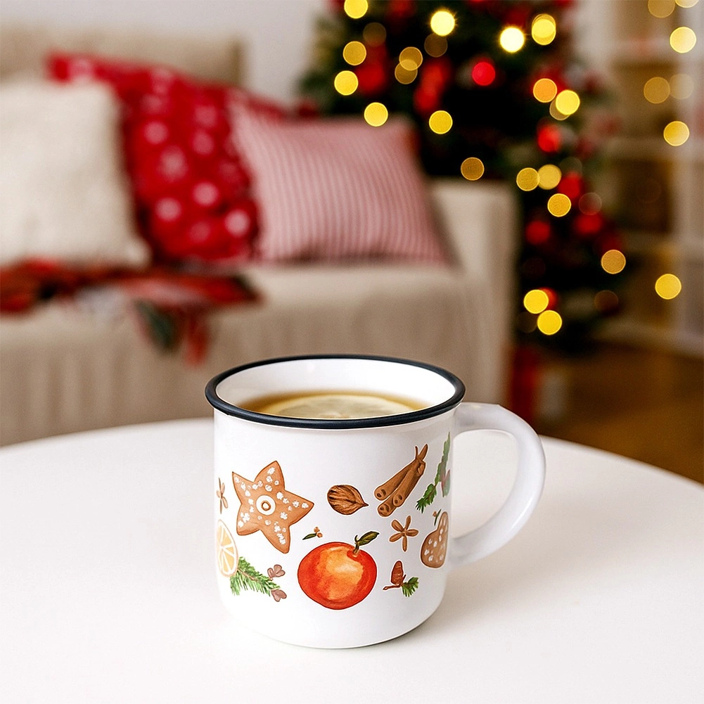 Vneste do svého domova sváteční atmosféru s elegantním bílým hrnkem zdobeným motivy perníčků, koření, ovoce a zimních dekorací. Černý lem na horním okraji podtrhuje čistý design a dodává hrnku výjimečný charakter. Ideální pro horké nápoje během chladných dnů.