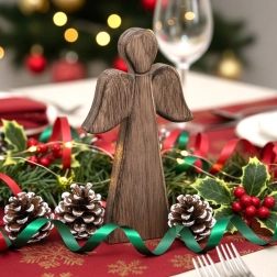 Tato stylová figurka anděla je vyrobena z kvalitního mangového dřeva s přirozenou kresbou, která dodává každému kusu jedinečný charakter. Díky pevnému plochému podstavci ji snadno umístíte na polici, komodu i svátečně prostřený stůl.