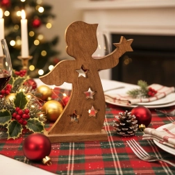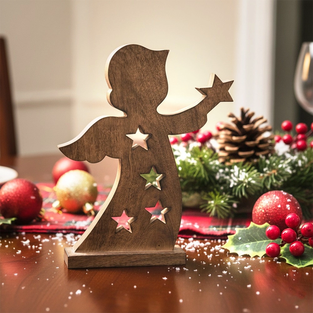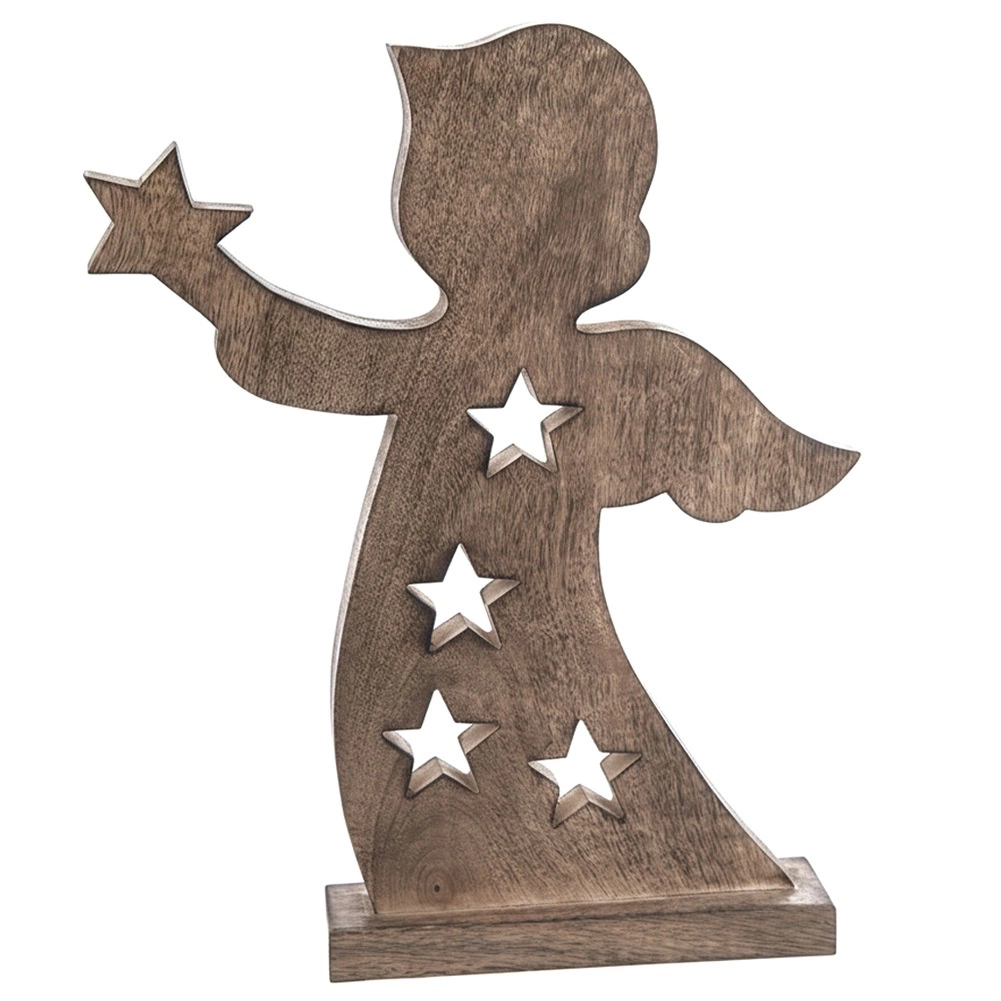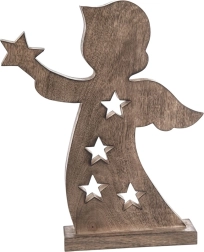 Tato andělská figurka z kvalitního mangového dřeva v přírodním odstínu přináší do interiéru klid a hřejivou atmosféru. Hvězdné perforace propouštějí světlo a vytvářejí efektní hru stínů – ideální pro zimní a vánoční dekor, ale také jako celoroční ozdoba.
