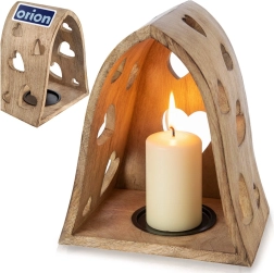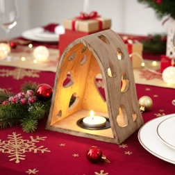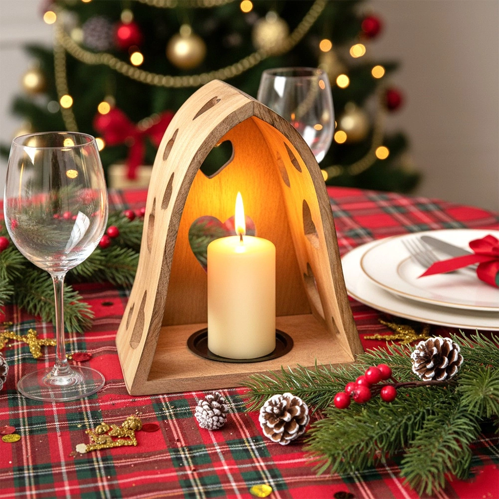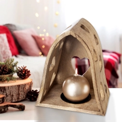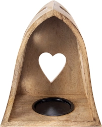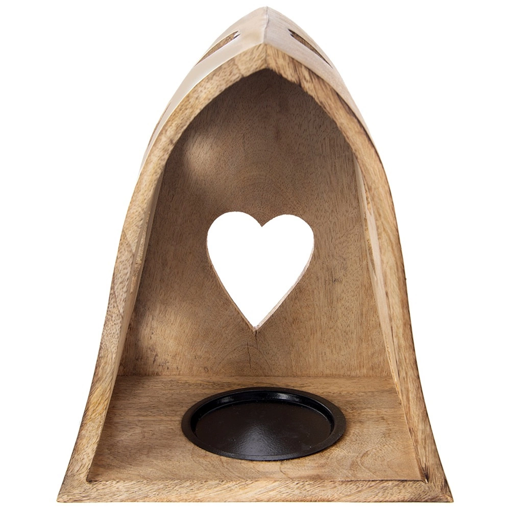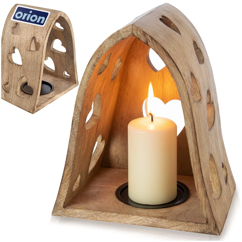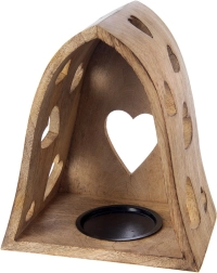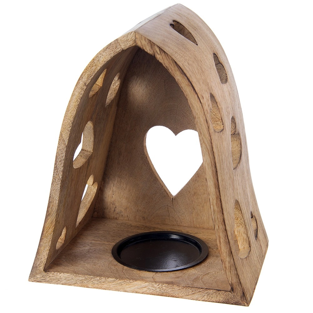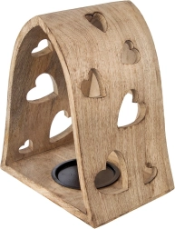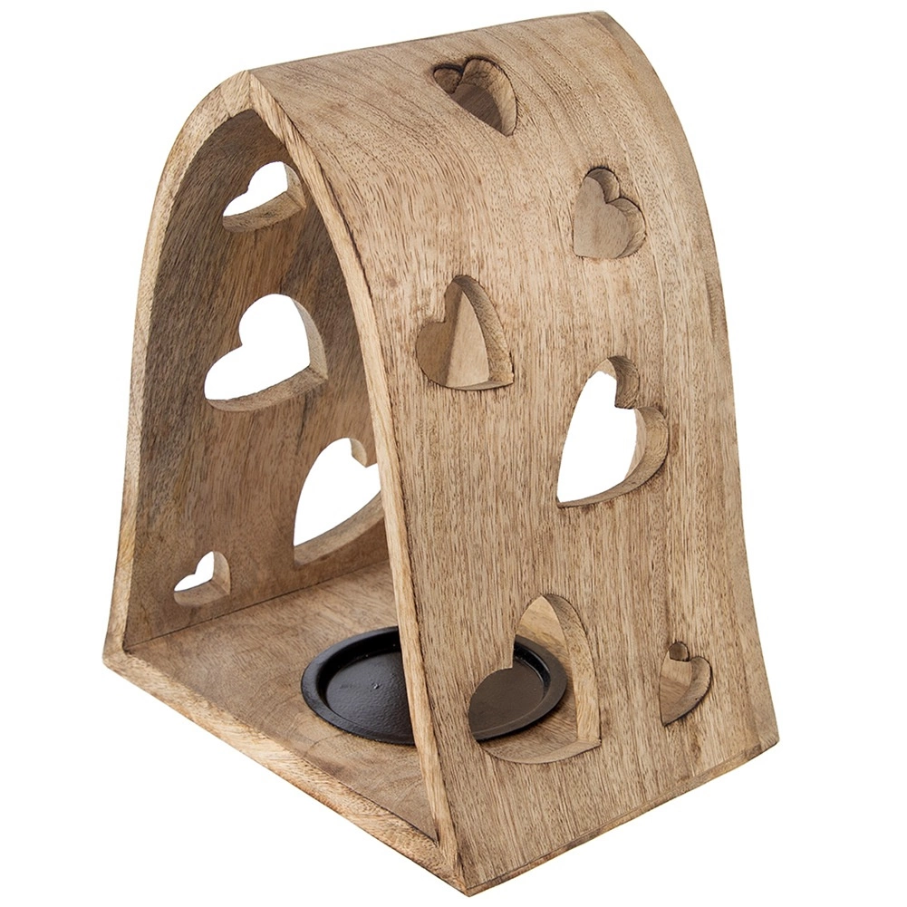 Tento dekorativní svícen v obloukovém tvaru kombinuje přírodní vzhled mangového dřeva s jemnými výřezy srdcí, které po rozsvícení promítají útulné světelné vzory do okolí. Ideální do obýváku, ložnice, koupelny i na krytou terasu.
