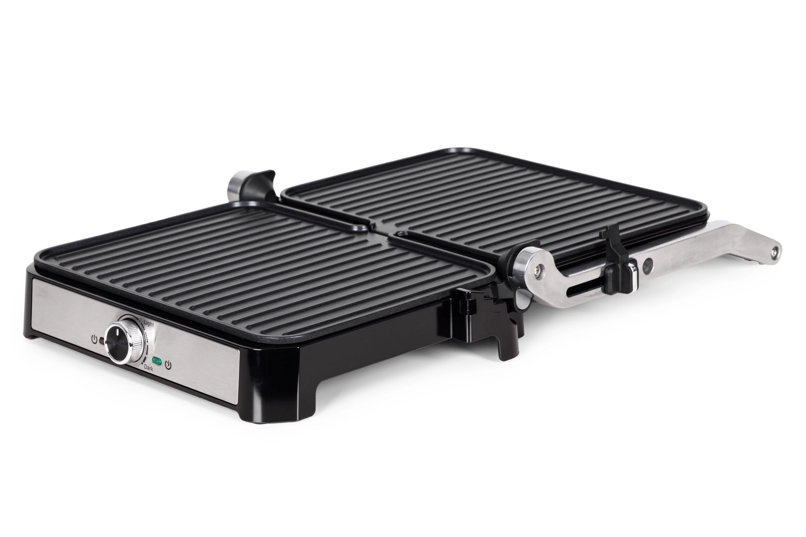 Otočný regulátor umožňuje přesně nastavit teplotu až na 220 °C, indikátory napájení a připravenosti hlídají správný okamžik pro vložení surovin. Plně rozevíratelné víko na 180° promění gril v velkou oboustrannou plochu 29,5 × 23 cm, takže snadno obsloužíte celou rodinu.