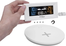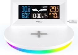 Stylová meteostanice GB213 je ideální pro chytrou domácnost. Velký barevný displej současně ukazuje vnitřní a venkovní teplotu, vlhkost, atmosférický tlak a trend, doplněné o grafické ikony předpovědi. Integrovaná Qi nabíječka umožňuje rychlé a pohodlné dobíjení kompatibilních smartphonů bez kabelů, k dispozici je i USB port (5 V / 1 A) pro kabelové nabíjení.