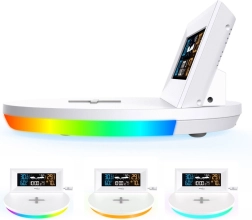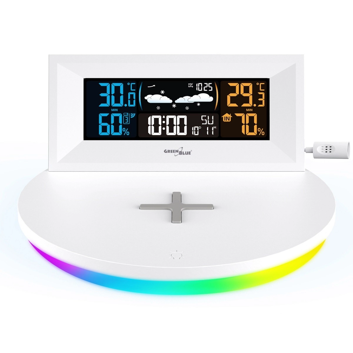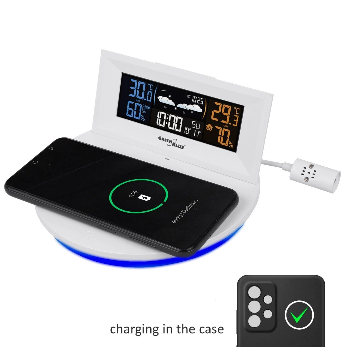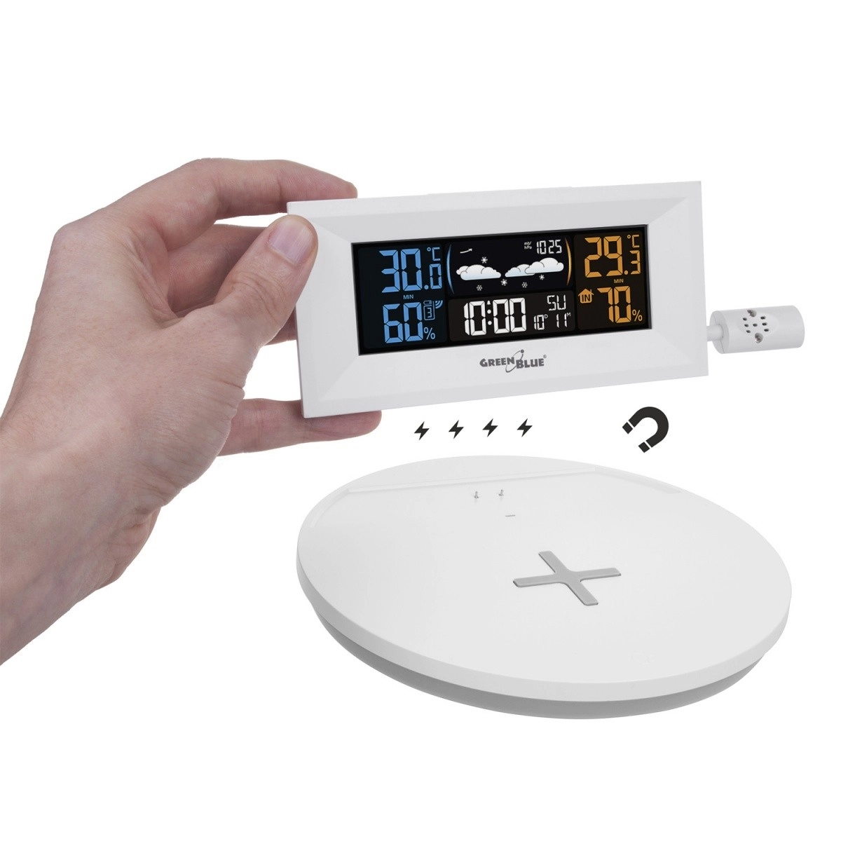 Moderní domácí meteostanice GREENBLUE GB213 kombinuje přesné měření počasí s praktickým nabíjením telefonu. Nabízí bezdrátové nabíjení Qi, barevný LCD displej, venkovní bezdrátový senzor a hodiny s budíkem a kalendářem. Díky přehlednému zobrazení teploty, vlhkosti, tlaku a grafické předpovědi máte přehled o podmínkách doma i venku, zatímco telefon pohodlně dobijete přímo ze základny.