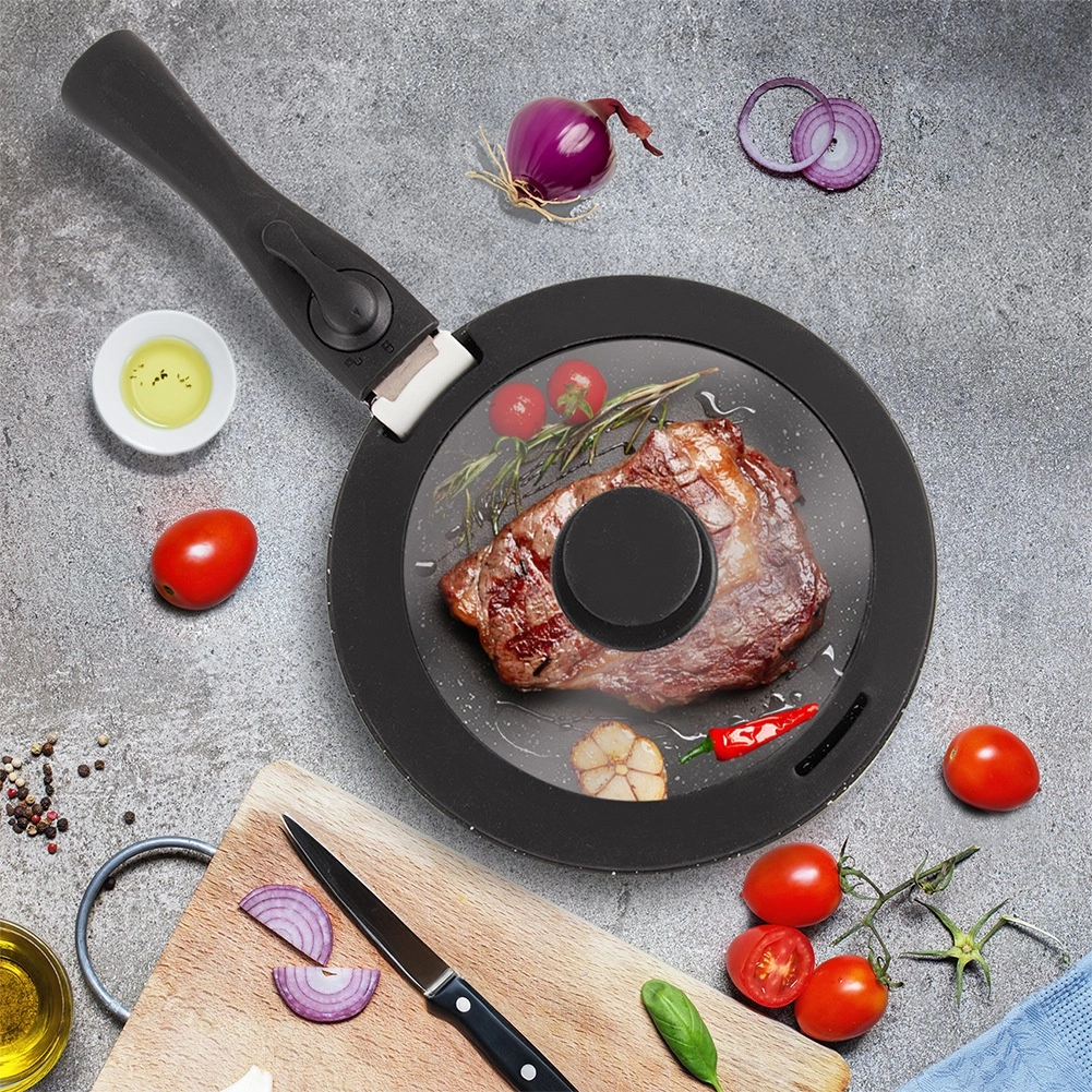 Díky podélnému otvoru pro odvod páry máte vaření pod kontrolou, zároveň jej lze využít jako pomůcku při slévání tekutin. Speciální profil s bočním výřezem je ideální pro nádobí s odnímatelnou rukojetí – poklice pohodlně sedí jak na pánvích, tak na hrncích, a můžete ji používat i v troubě do 220 °C.