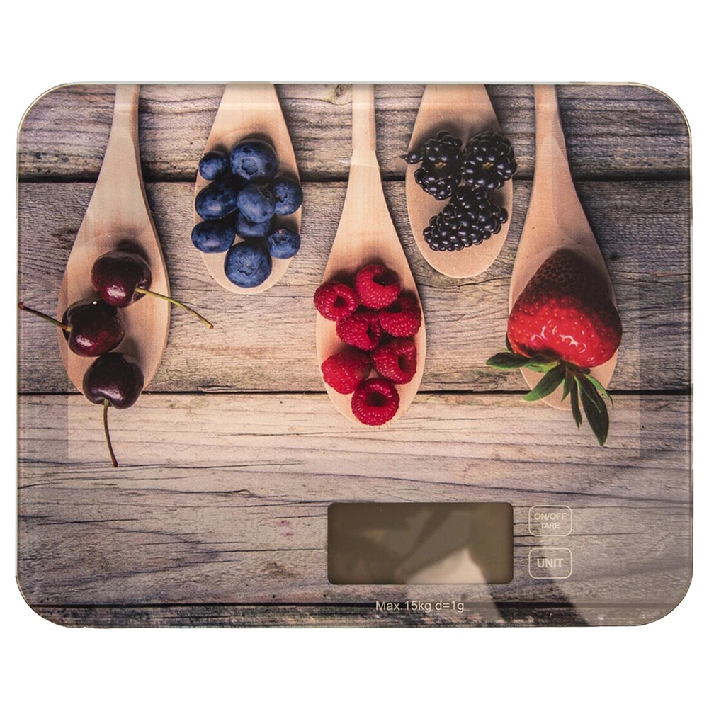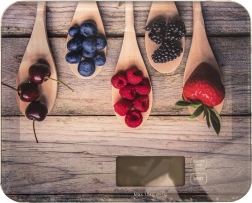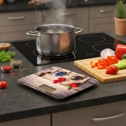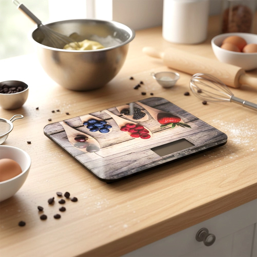 Tato digitální kuchyňská váha kombinuje moderní vzhled s praktičností. Tvrzené sklo s dekorativním motivem ovoce je odolné a snadno se udržuje, velký LCD displej zajišťuje pohodlné a rychlé čtení hodnot. Díky nosnosti 15 kg zvládne jak drobné suroviny, tak i těžší nádoby.