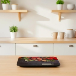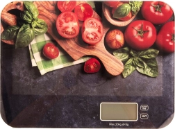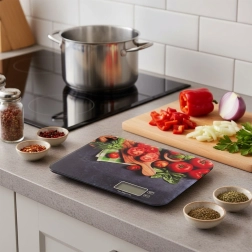 Stylová skleněná kuchyňská váha s nosností až 20 kg a přesným LCD displejem. Nabízí více jednotek měření (g, kg, lb, oz, ml, fl.oz), funkci TARE, automatické vypnutí a protiskluzové nožky. Díky temperovanému sklu s dekorativním motivem rajčat se snadno čistí a skvěle zapadne do moderní kuchyně.