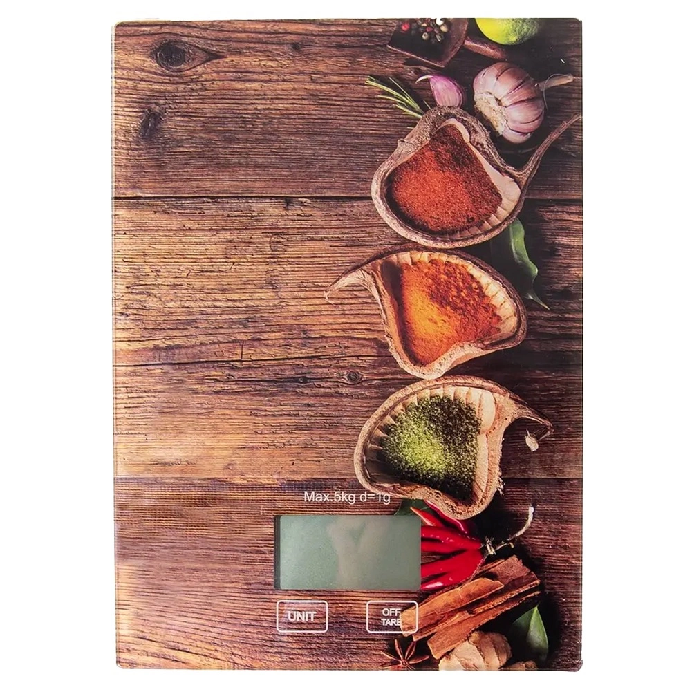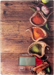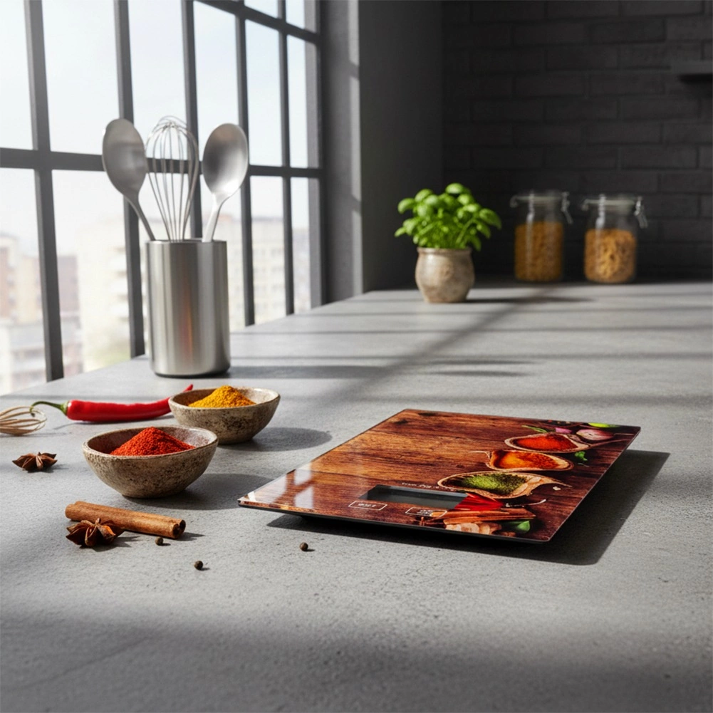 Kompaktní skleněná kuchyňská váha s nosností 5 kg a přesným LCD displejem pro rychlé a přesné vážení surovin. Nabízí více jednotek měření (g, oz, ml, lb/oz, fl oz), praktickou funkci TARE, automatické vypnutí pro úsporu energie a protiskluzové nožky pro stabilitu. Stylový dekór s motivem koření skvěle zapadne do každé kuchyně.