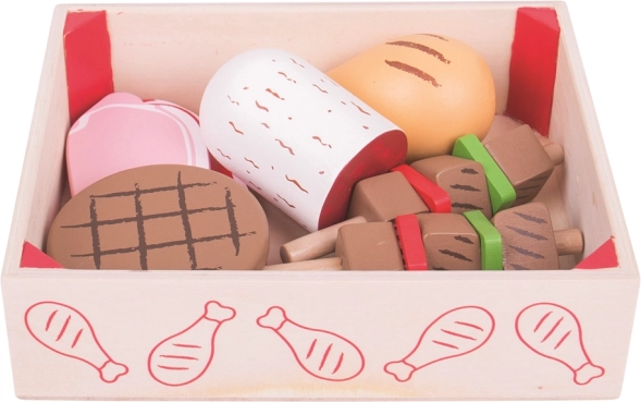 Tato kvalitní dřevěná přepravka je plná „masných“ specialit, které děti znají z kuchyně. Najdou v ní slaninu, steak, klobásu, kuře a další kousky, se kterými snadno připraví hostinu pro celou rodinu. Po hře vše uklidí zpět do praktického boxu – pořádek je raz dva.