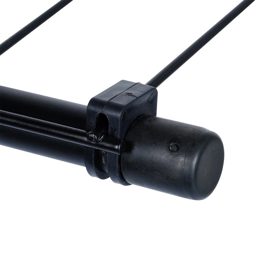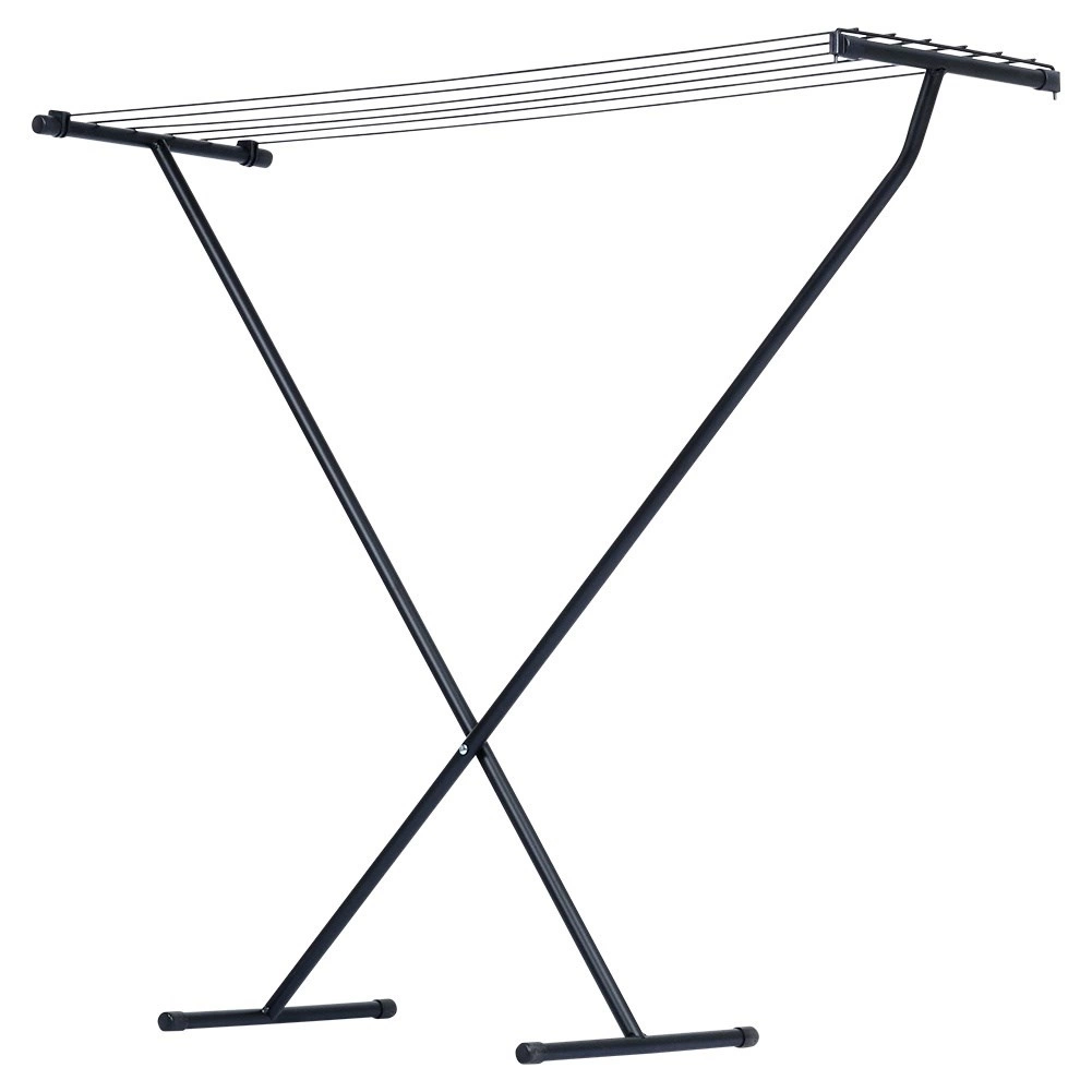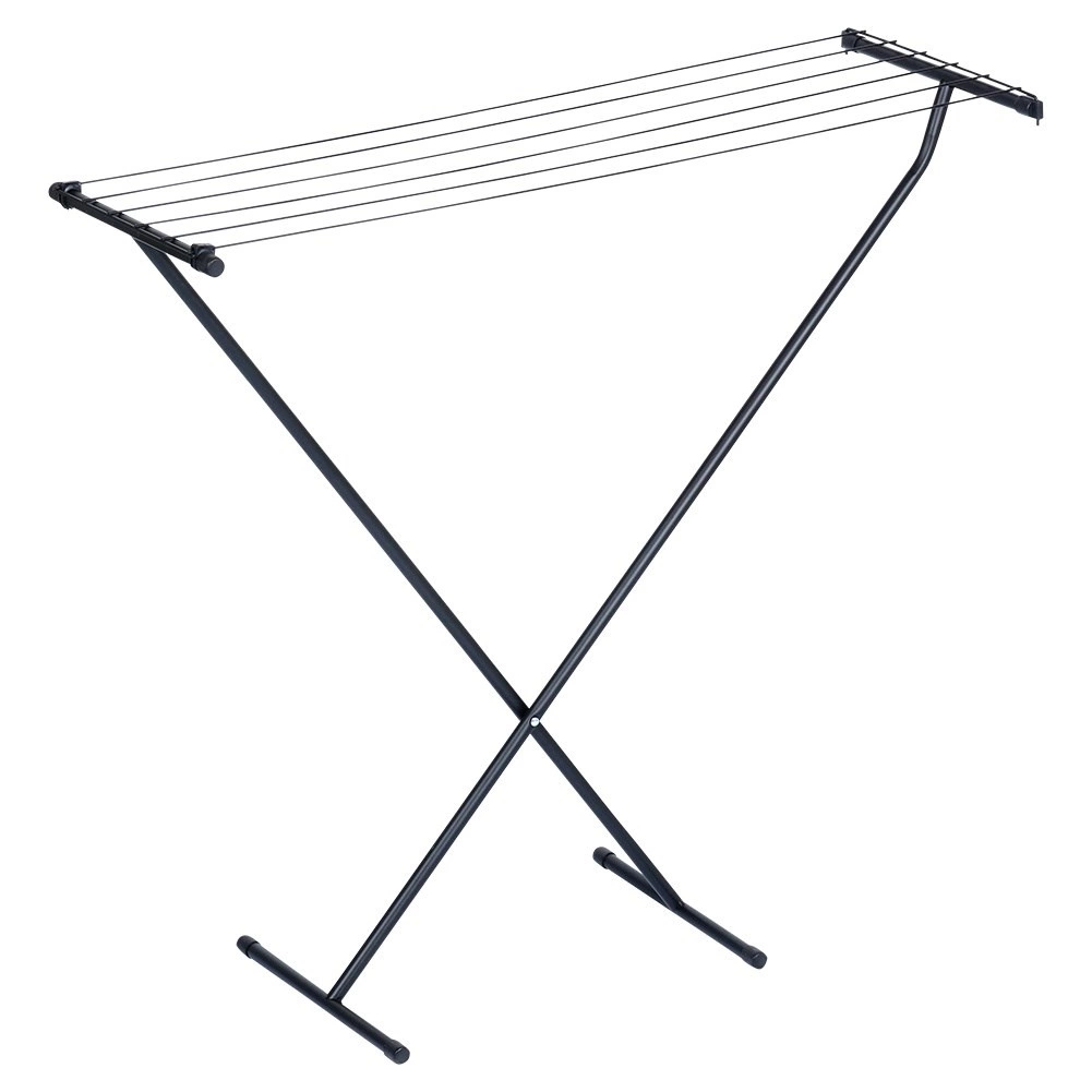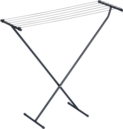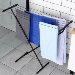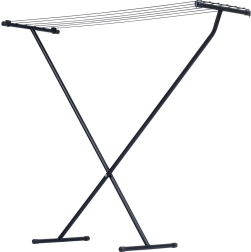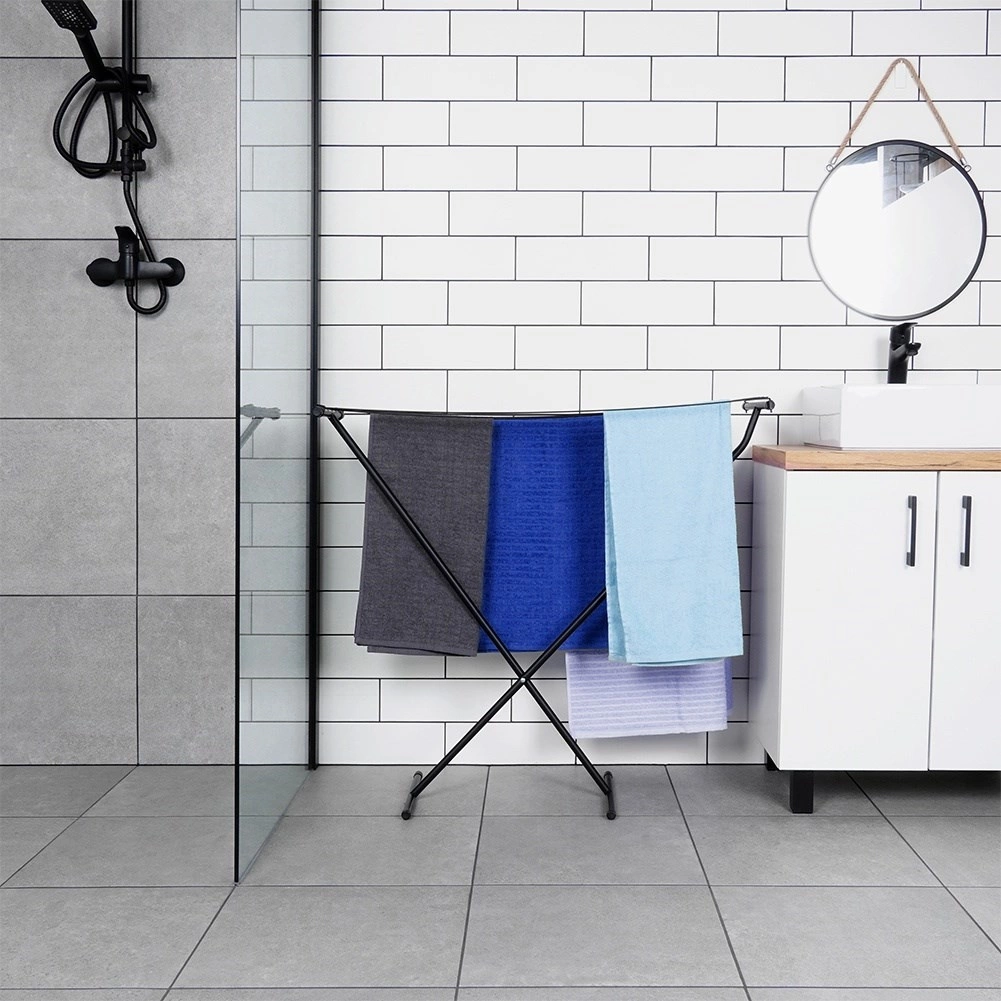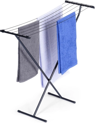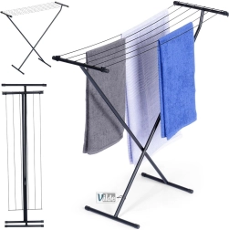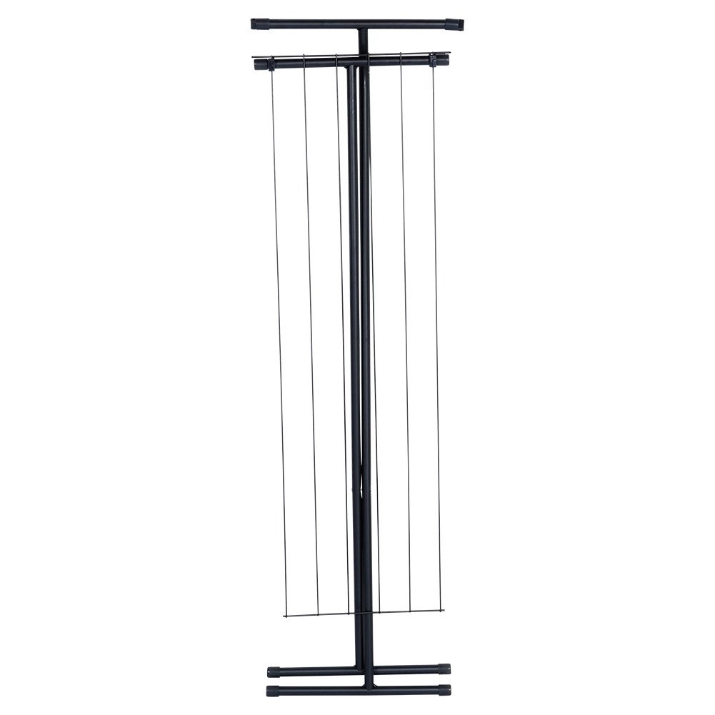 Praktický skládací sušák na prádlo v elegantní černé barvě kombinuje robustní kovové provedení s nenáročným skladováním. Díky práškově lakované oceli je odolný vůči vlhkosti a vhodný pro používání v interiéru i exteriéru – v koupelně, na balkoně, terase nebo na zahradě.
