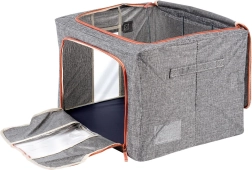 Praktické průhledné panely umožní okamžitý náhled na obsah bez otevírání. Obal má zipové otvory shora i zepředu pro pohodlný přístup a dva robustní úchyty pro snadné přenášení. Když se zrovna nepoužívá, jednoduše jej složíte naplocho a šetříte místo.