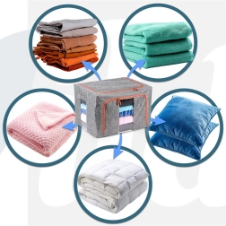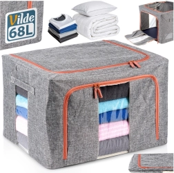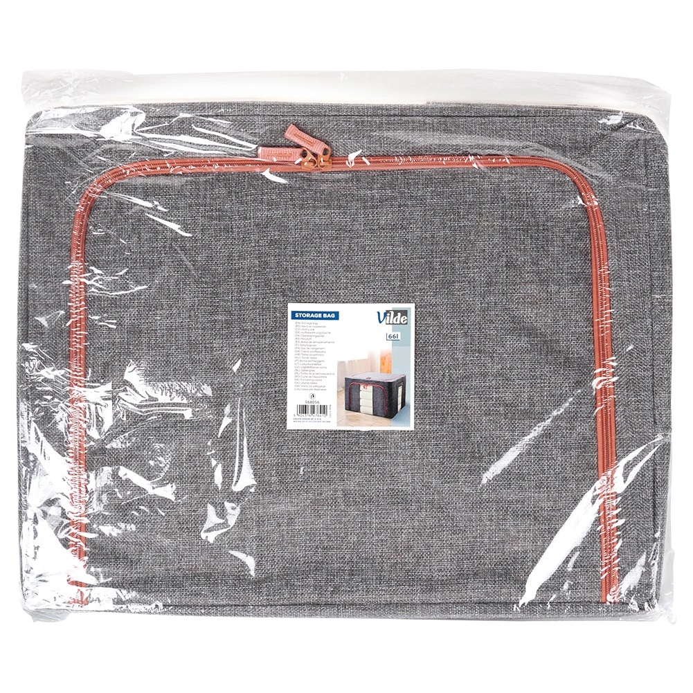 Udržujte domácnost organizovanou s prostorným obalem o objemu 66 l a rozměrech 50 × 40 × 33 cm. Odolná polyesterová tkanina v šedém melíru s kontrastním zipem spolehlivě ochrání textilie před prachem, vlhkostí a škůdci. Díky pevné vnitřní konstrukci drží tvar a lze jej snadno zasunout do skříně nebo pod postel.