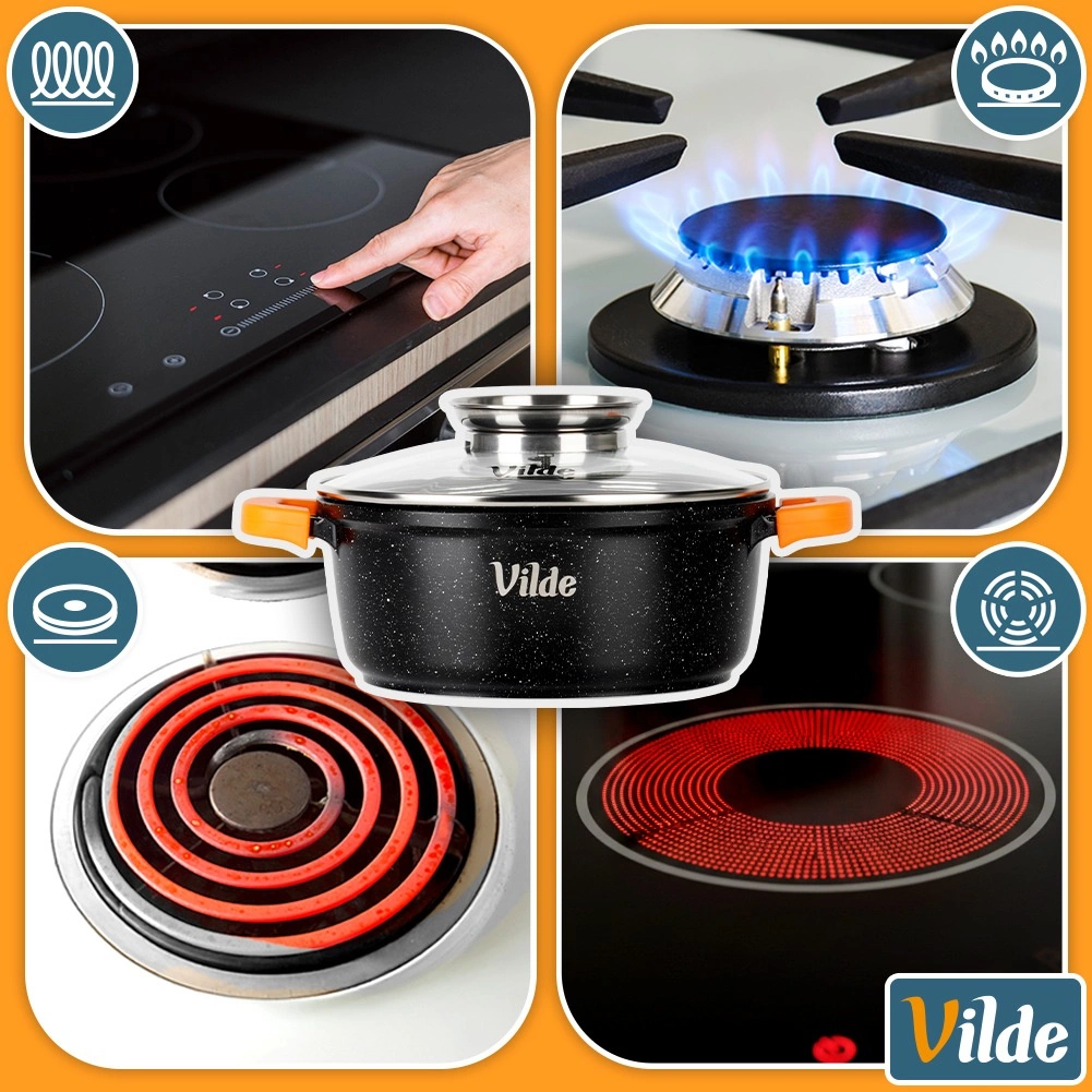 Zesílené dno se sendvičovou konstrukcí efektivně vede teplo a je vhodné pro plyn, elektřinu, sklokeramiku i indukci.