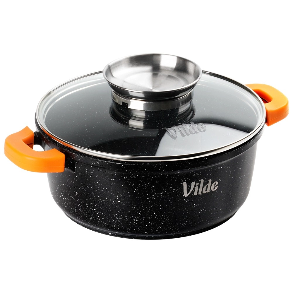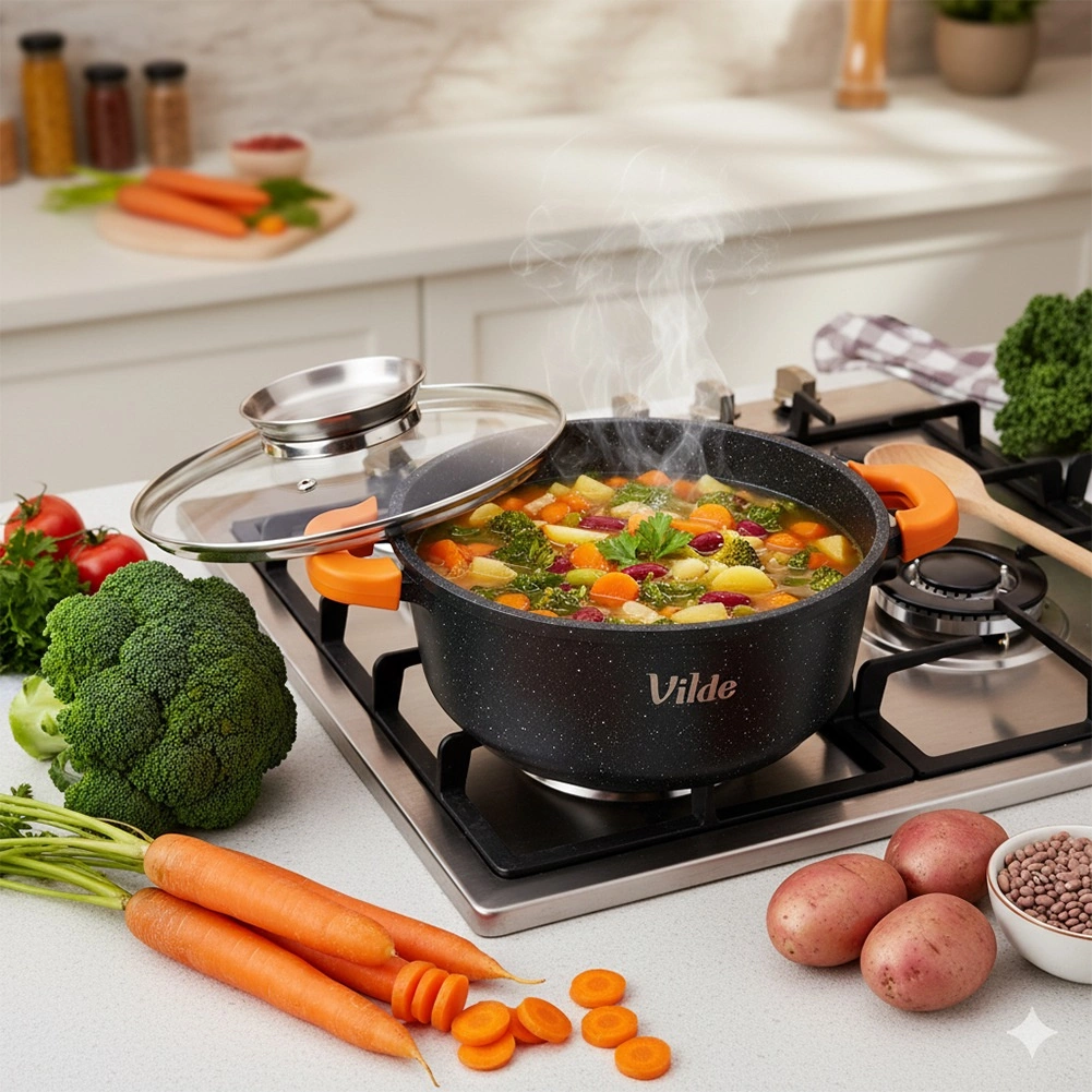 Uvařte polévky, dušené maso i aromatické guláše s menším množstvím oleje díky nepřilnavé granitové vrstvě. Skleněná poklice s širokým nerezovým úchytem funguje jako dávkovač – bez zvedání víka přilijete vodu, víno či vývar a zachováte ideální podmínky pro vaření.