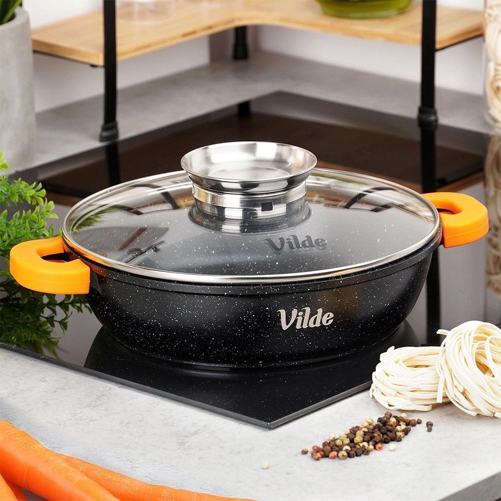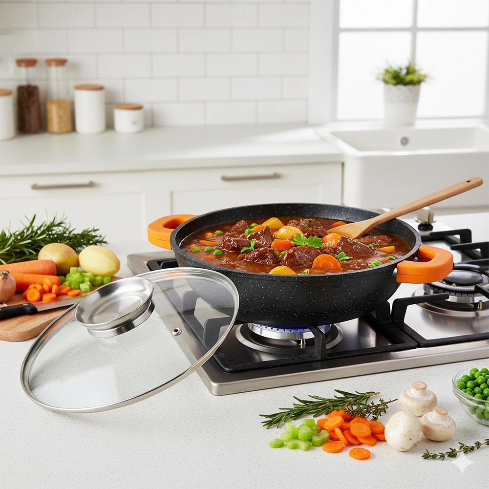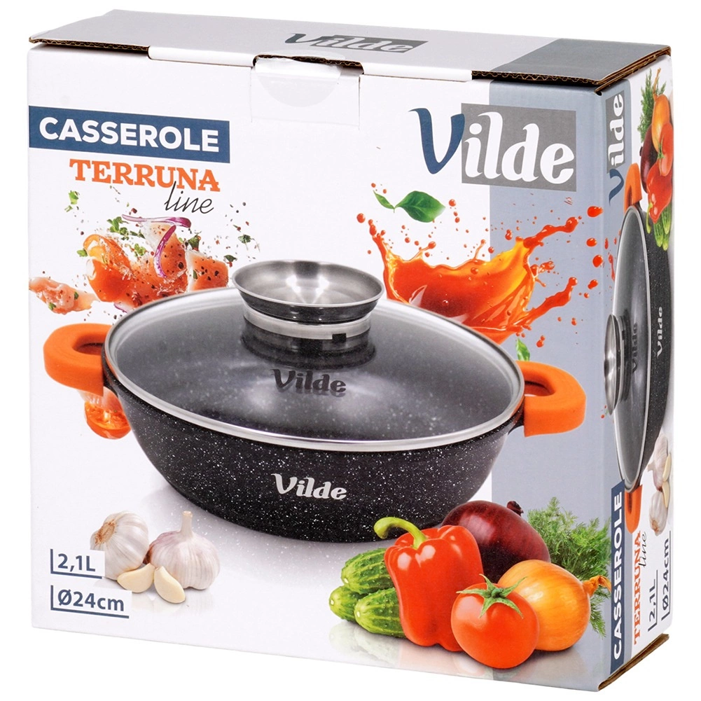 Hluboká pánev TERRUNA AROMA 24 cm je univerzální řešení pro každodenní vaření – od rychlého smažení přes dušení až po zapékání. Odolné hliníkové tělo s nepřilnavou granitovou vrstvou zajišťuje rovnoměrný rozvod tepla a snadné uvolnění pokrmů. Skleněná poklice s nerezovým úchytem a integrovaným dávkovačem dovolí přilévat vodu, víno či omáčky bez nadzvednutí víka.