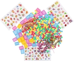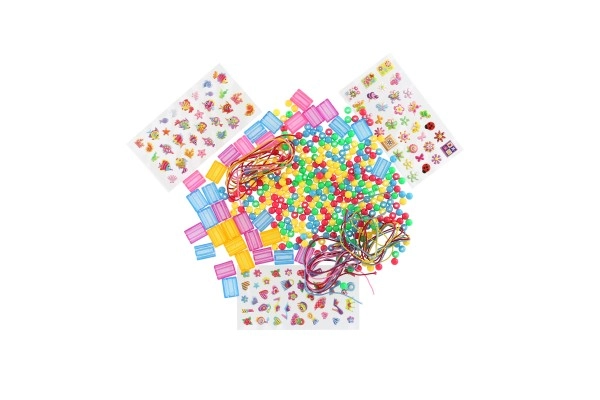 Součástí balení jsou čtvercové dílky, plastové korálky v různých tvarech a barvách, pružné gumičky a pěnové samolepky pro dotvoření jedinečného stylu. Skvělá volba pro domácí tvoření, dětské oslavy i dárky.